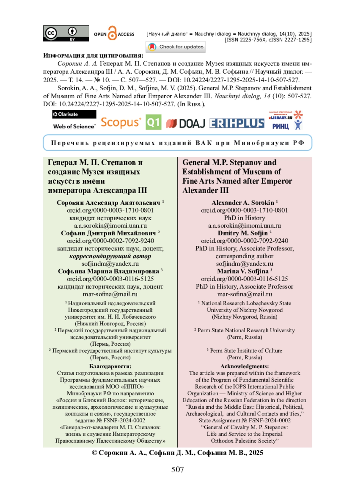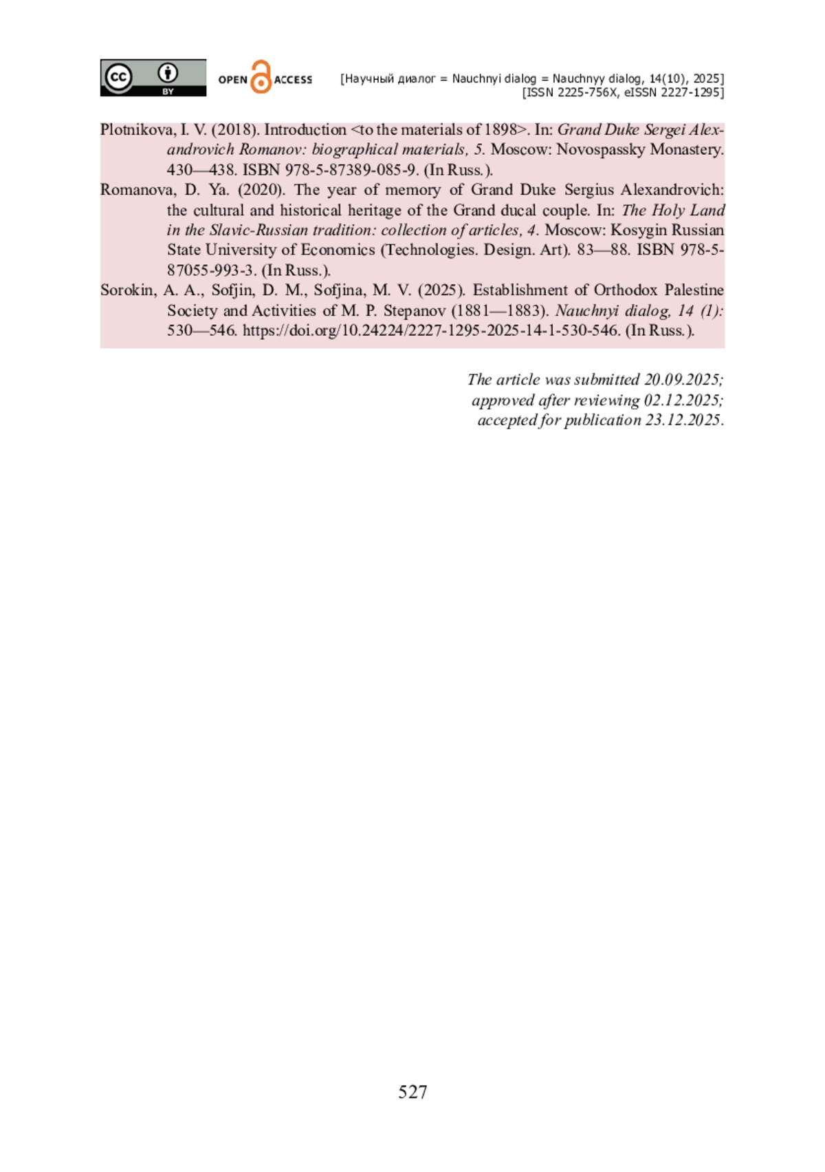 14. Сорокин А. А. Создание Православного Палестинского общества и деятельность М. П. Степанова (1881-1883) / А. А. Сорокин, Д. М. Софьин, М. В. Софьина // Научный диалог. - 2025. - Т. 14. - № 1. - С. 530-546. - https://doi.org/10.24224/2227-1295-2025-14-1-530-546.