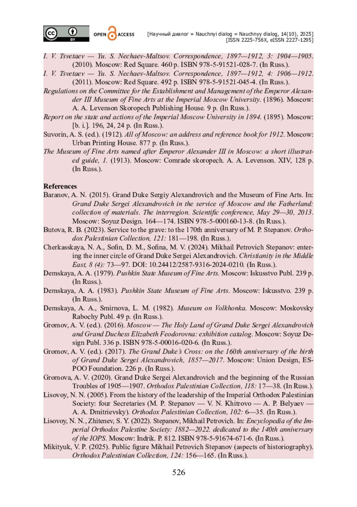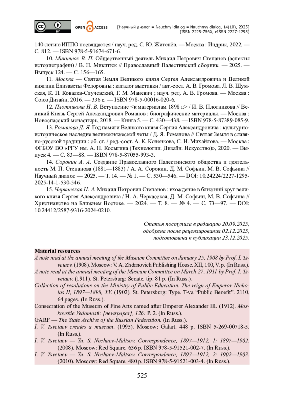 15. Черкасская Н. А. Михаил Петрович Степанов : вхождение в ближний круг великого князя Сергея Александровича / Н. А. Черкасская, Д. М. Софьин, М. В. Софьина // Христианство на Ближнем Востоке. - 2024. - Т. 8. - № 4. - С. 73-97. - https://doi.org/10.24412/2587-9316-2024-0210.
