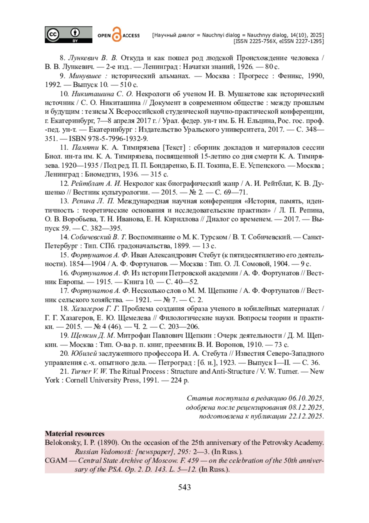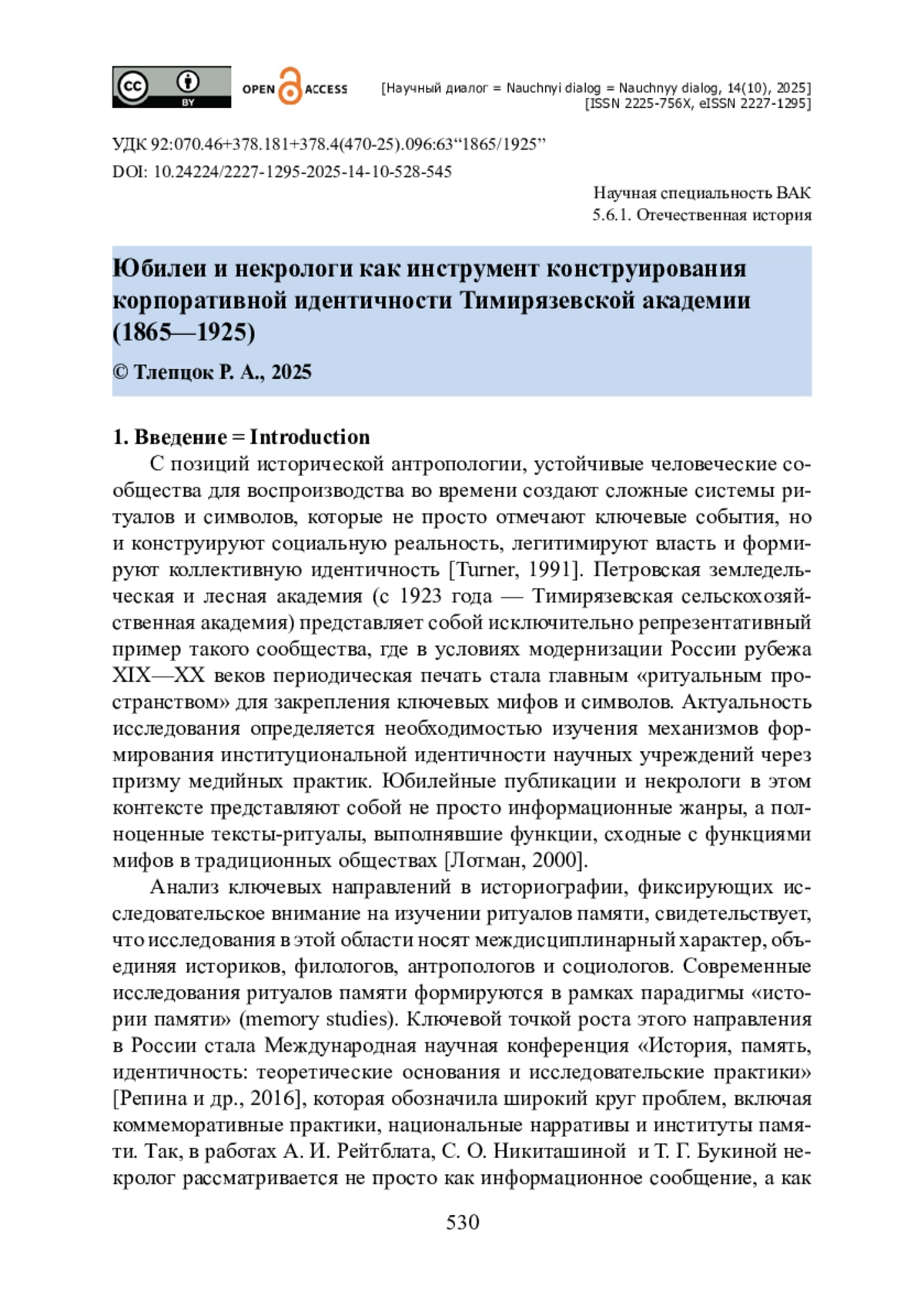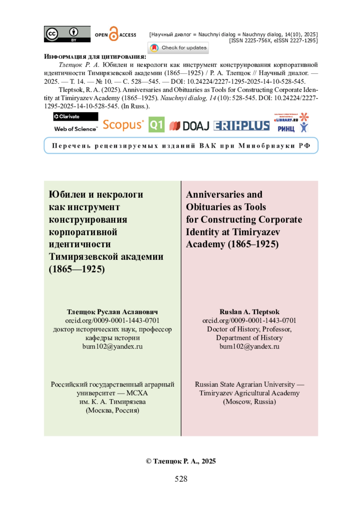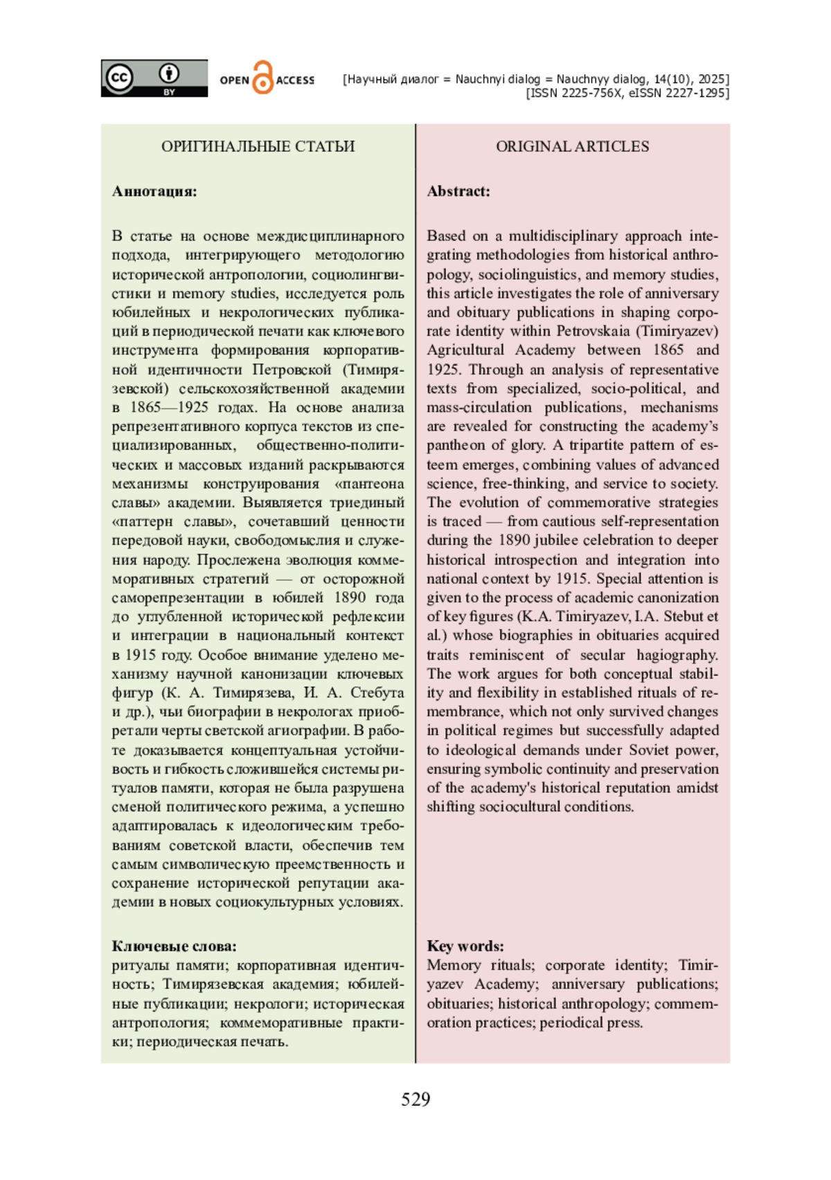 В статье на основе междисциплинарного подхода, интегрирующего методологию исторической антропологии, социолингвистики и memory studies, исследуется роль юбилейных и некрологических публикаций в периодической печати как ключевого инструмента формирования корпоративной идентичности Петровской (Тимирязевской) сельскохозяйственной академии в 1865—1925 годах. На основе анализа репрезентативного корпуса текстов из специализированных, общественно-политических и массовых изданий раскрываются механизмы конструирования «пантеона славы» академии. Выявляется триединый «паттерн славы», сочетавший ценности передовой науки, свободомыслия и служения народу. Прослежена эволюция коммеморативных стратегий — от осторожной саморепрезентации в юбилей 1890 года до углубленной исторической рефлексии и интеграции в национальный контекст в 1915 году. Особое внимание уделено механизму научной канонизации ключевых фигур (К. А. Тимирязева, И. А. Стебута и др.), чьи биографии в некрологах приобретали черты светской агиографии. В работе доказывается концептуальная устойчивость и гибкость сложившейся системы ритуалов памяти, которая не была разрушена сменой политического режима, а успешно адаптировалась к идеологическим требованиям советской власти, обеспечив тем самым символическую преемственность и сохранение исторической репутации академии в новых социокультурных условиях.
