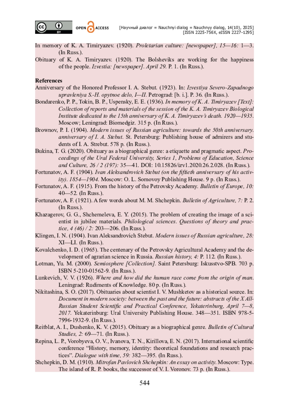 2. Букина Т. Г. Некролог как биографический жанр : этикетно-прагматический аспект / Т. Г. Букина // Известия Уральского федерального университета. Сер. 1, Проблемы образования, науки и культуры. - 2020. - Т. 26. - № 2 (197). - С. 35-41. - https://doi.org/10.15826/izv1.2020.26.2.028