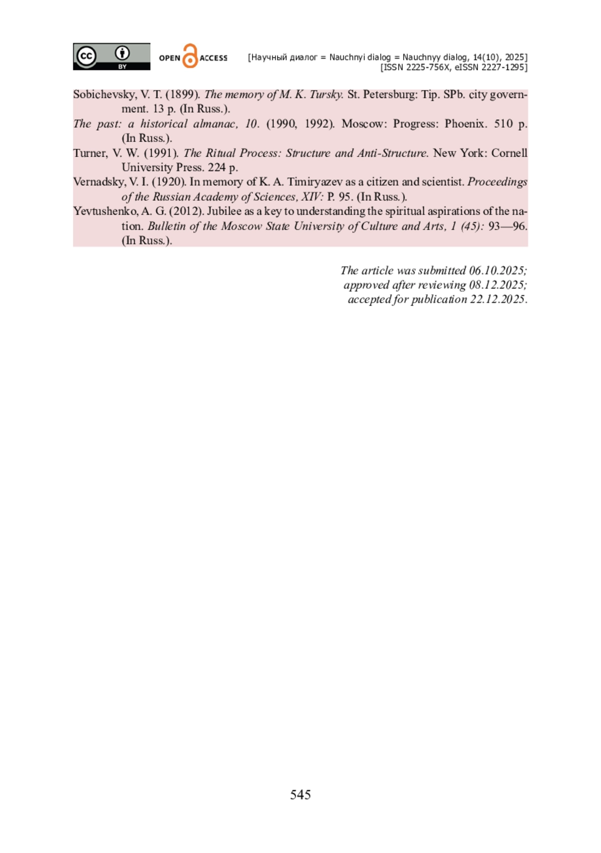 4. Евтушенко А. Г. Юбилей как ключ к пониманию духовных устремлений нации / А. Г. Евтушенко // Вестник Московского государственного университета культуры и искусств. - 2012. - № 1 (45). - С. 93-96.