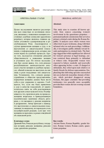 Целью исследования является рассмотрение всех известных из источников эпизодов, связанных с появлением женщин в постоянных судебных комиссиях (quaestiones perpetuae), которые являлись главным органом уголовного судопроизводства в республиканском Риме. Анализируются и случаи привлечения женщин к суду, и их выступления со свидетельскими показаниями, и неформальные роли, которые они могли играть на судебных процессах. Кроме того, исследуется отношение римской общественности к появлению женщин в уголовном суде. По итогам исследования был сделан вывод, что, хотя римское республиканское законодательство допускало участие женщин в судебных процессах, обычай позволял им выступать на них лишь в роли подсудимых или свидетельниц. Установлено, что, согласно распространённым в обществе представлениям, порядочная женщина должна была вести себя в суде сдержанно и скромно. Сообщается, что, если она была привлечена к суду в качестве подсудимой, её защиту полагалось взять на себя родственникам или друзьям семьи мужского пола. Подчёркивается, что, произнося речь на процессе, женщина вторгалась в принадлежавшую исключительно мужчинам область риторики, а это вызывало у римлян неприятие и раздражение. Автор приходит к выводу, что выступления со свидетельскими показаниями, по-видимому, не порождали столь неодобрительной реакции, если при этом женщина не выходила за рамки отведённой ей социальной роли.
