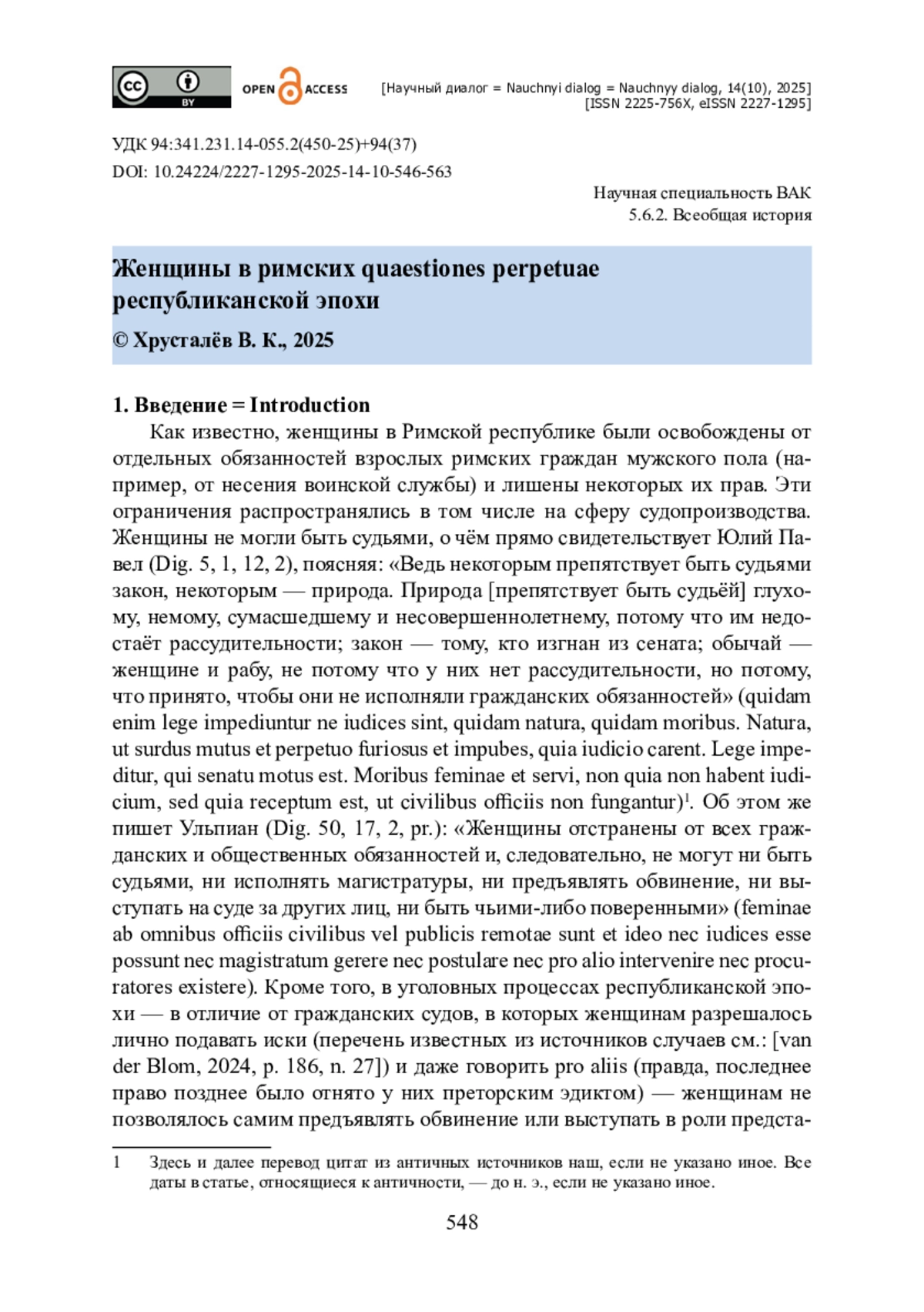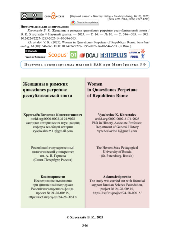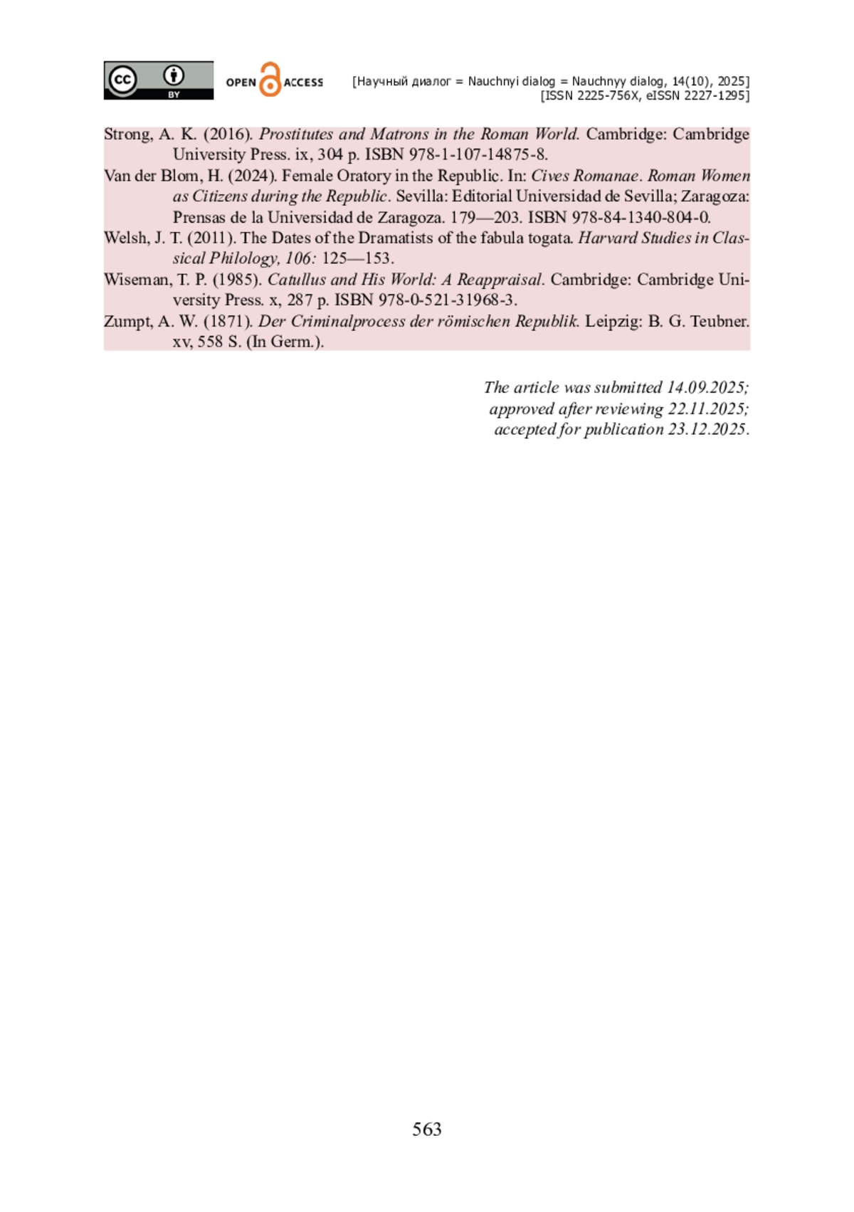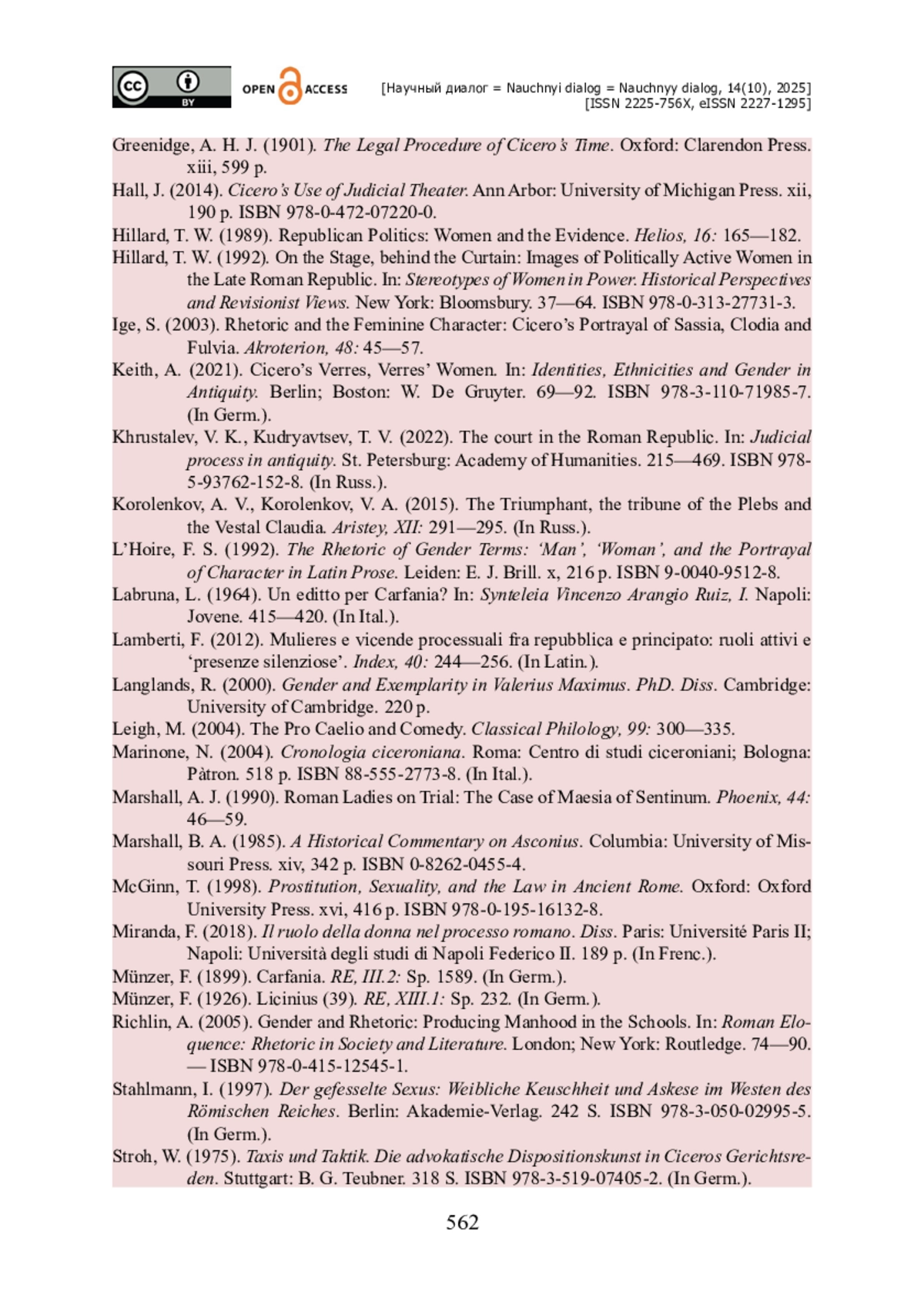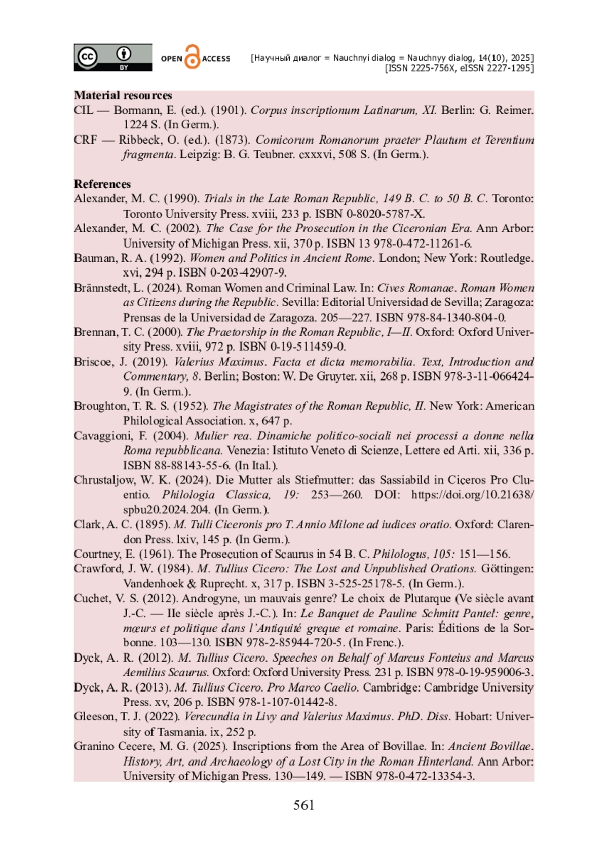 42. Van der Blom H. Female Oratory in the Republic / H. van der Blom // Cives Romanae. Roman Women as Citizens during the Republic / ed. C. Rosillo-López, S. Lacorte. - Sevilla : Editorial Universidad de Sevilla ; Zaragoza : Prensas de la Universidad de Zaragoza, 2024. - Pp. 179-203. - ISBN 978-84-1340-804-0.