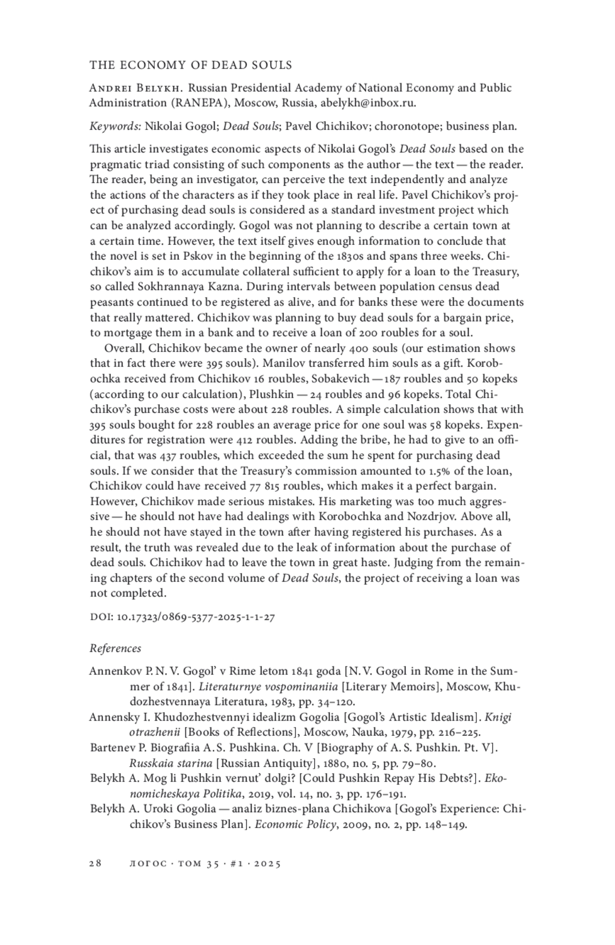 Работа посвящена экономическим вопросам романа «Мертвые души». Используется понятие прагматической триады, компонентами которой являются автор - текст - читатель. Читатель, исследователь может воспринимать текст самостоятельно, изучать действия героев книги так же, как и происходящее в действительности. Деятельность Чичикова по покупкам мертвых душ рассматривается как инвестиционный проект - его можно проанализировать стандартным образом. Гоголь не ставил задачи описать конкретный город и определенное время, но в самом тексте книги содержится достаточно информации, позволяющей сделать вывод о том, что действие происходит в Пскове в начале 1830-х годов в течение трех недель. Цель Чичикова - сформировать залоговую массу для получения кредита в Сохранной казне. В промежутках между переписями умершие крестьяне по документам считались живыми, а банки работали с документами. Чичиков собирался по дешевке купить мертвых душ, заложить их в банке и получить кредит в размере 200 руб. за душу. Всего Чичиков стал собственником почти 400 душ (по нашей оценке - 395). Манилов души подарил, Коробочке было заплачено 16 руб., Собакевичу - 187 руб. 50 коп. (по нашей оценке), Плюшкину - 24 руб. 96 коп. Общие затраты на покупку составили около 228 руб. Средняя цена за одну душу - 58 коп. Издержки, связанные с регистрацией, составили около 412 руб., а с учетом взятки, которую пришлось дать чиновнику, - 437 руб. Это было больше, чем ушло на сами покупки. Всего было затрачено около 665 руб. С учетом взимаемой Сохранной казной комиссии в 1,5% от суммы кредита Чичиков мог получить 77 815 руб. - прекрасный результат. Но Чичиков совершил серьезные ошибки. Его маркетинг был слишком агрессивен - не нужно было связываться с Коробочкой и Ноздревым и не стоило после регистрации сделок задерживаться в городе. В результате правда о покупке мертвых душ стала известной всем и Чичикову пришлось спешно уехать. Судя по сохранившимся главам второго тома, проект получения кредита так и не был завершен.