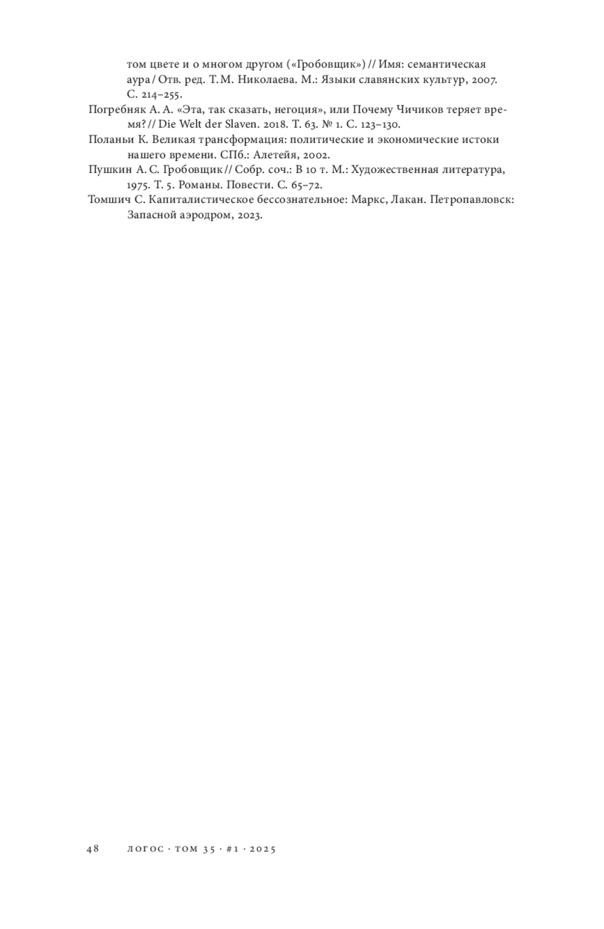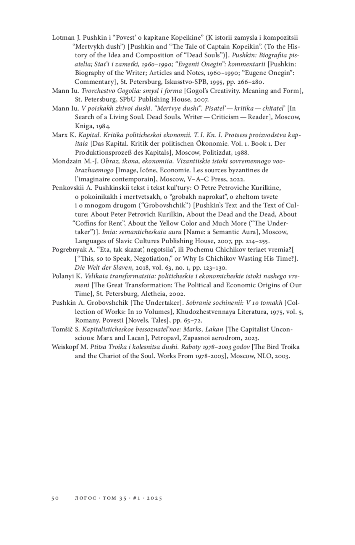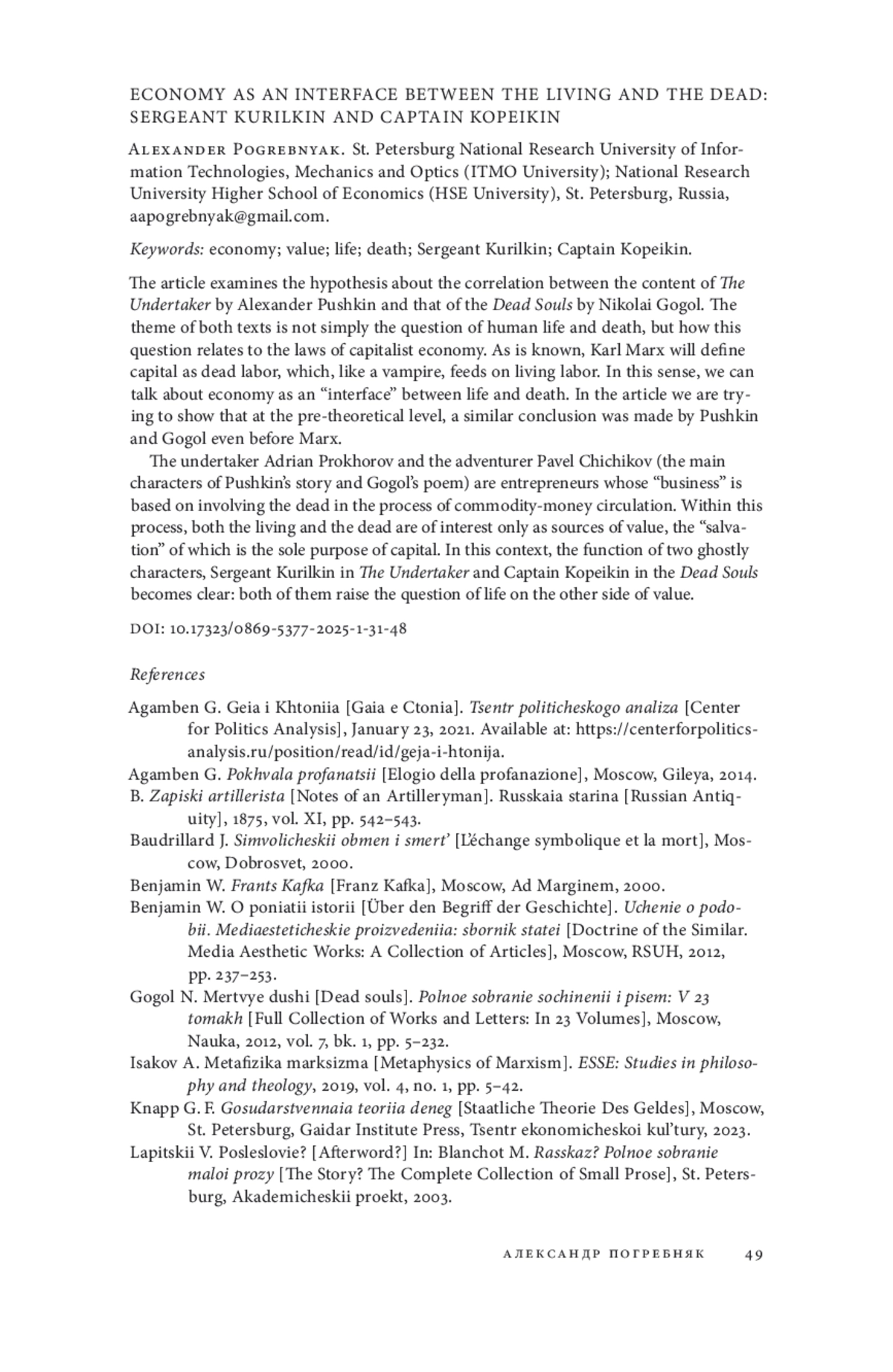 В статье выдвигается гипотеза о наличии смысловой связи между «Гробовщиком» Александра Пушкина и «Мертвыми душами» Николая Гоголя. Темой обоих произведений выступает не столько вопрос о жизни и смерти человека, сколько то, каким образом этот вопрос соотносится с законами капиталистической экономики. Как известно, Карл Маркс будет определять капитал как мертвый труд, который, подобно вампиру, питается живым трудом. В этом смысле можно говорить об экономике как об интерфейсе между жизнью и смертью. Автор статьи показывает, что на дотеоретическом уровне подобное заключение еще до Маркса сделали Пушкин и Гоголь. Гробовщик Адриан Прохоров и авантюрист Павел Чичиков (главные герои повести Пушкина и поэмы Гоголя) принадлежат к тому типу предпринимателей, чей бизнес базируется на вовлечении мертвецов в процесс товарно-денежного обращения. В рамках этого процесса как живые, так и мертвые представляют интерес лишь как источники стоимости, «спасение» которой и есть единственная цель капитала. В этом контексте становится ясна функция двух призрачных персонажей — сержанта Курилкина в «Гробовщике» и капитана Копейкина в «Мертвых душах»: оба они ставят вопрос о жизни по ту сторону стоимости.