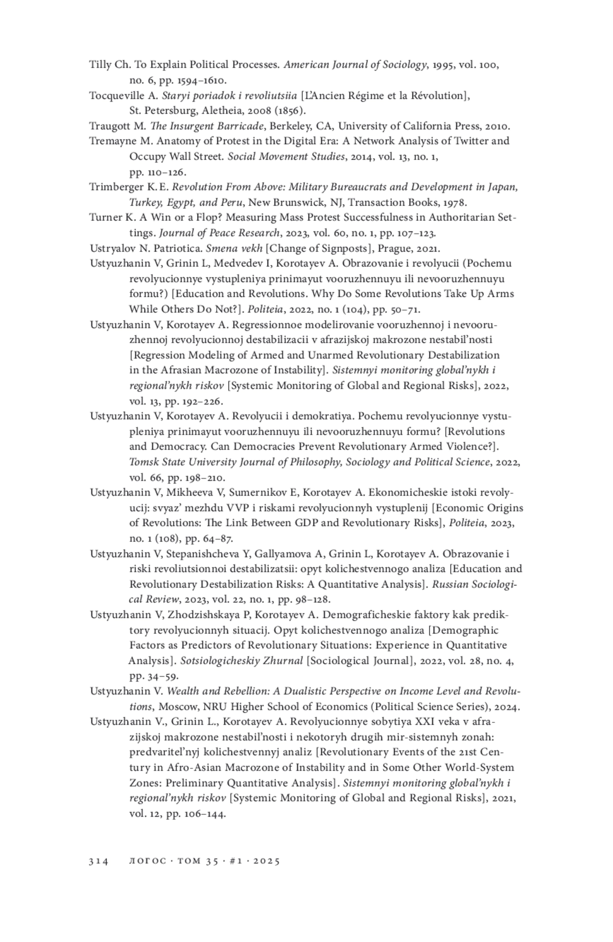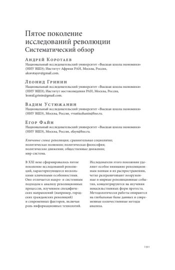 66. Устюжанин В. В., Медведев И. А., Уфимцев А. А., Гринин Л. Е., Коротаев А. В. Факторы начала невооруженных революционных выступлений: опыт комплексного анализа // Социологическое обозрение. 2025. Т. 24. № 1. EDN: DPCAEF