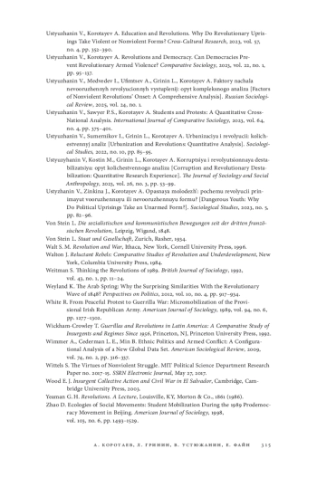 294. Rasler K., Thompson W. R., Bou Nassif H. The Extent of Military Involvement in Nonviolent, Civilian Revolts and Their Aftermath // Handbook of Revolutions in the 21st Century / J. A. Goldstone, L. Grinin, A. Korotayev (eds). Cham: Springer, 2022. P. 739-779.