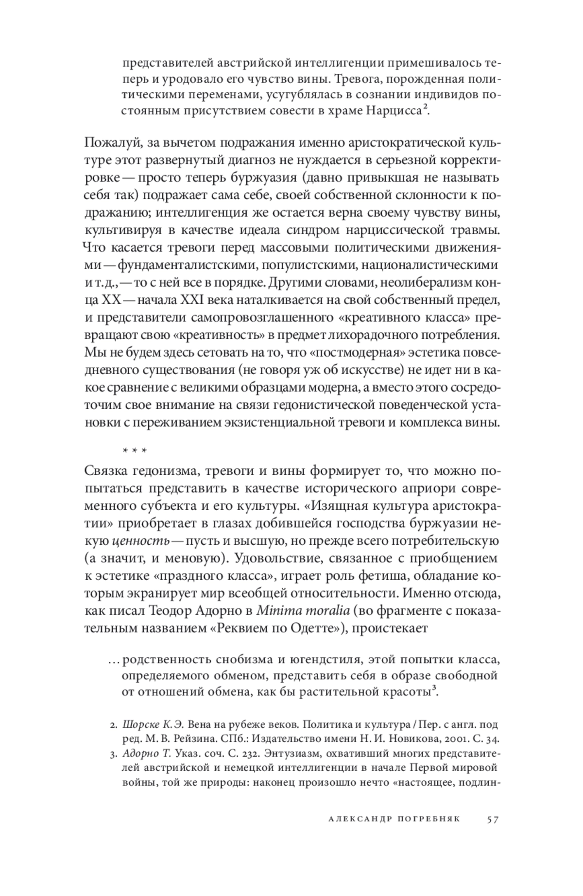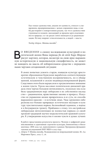 Во введении к своему исследованию культурной и политической жизни Вены периода fin de siècle Карл Шорске рисует картину, которая, несмотря на свою ярко выраженную историческую и национальную специфичность, не может не наводить на мысль об избирательном сродстве с определенными чертами сегодняшней ситуации