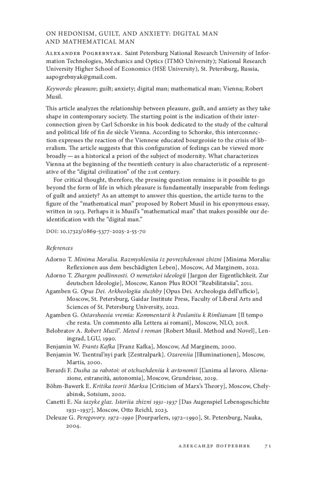 В статье анализируются отношения между удовольствием, виной и тревогой, как они складываются в современном обществе. Отправной точкой служит указание на их взаимосвязь, данное Карлом Шорске в книге, посвященной исследованию культурной и политической жизни Вены периода fin de siècle. Согласно Шорске, в этой взаимосвязи выражается реакция венской образованной буржуазии на кризис либерализма. В статье делается предположение, что данную конфигурацию чувств можно рассматривать более широко — как историческое априори субъекта современности. То, что характеризует Вену начала двадцатого века, характерно и для представителя «цифровой цивилизации» века двадцать первого. Для критической мысли поэтому остается актуальным вопрос о том, возможно ли выйти за рамки той формы жизни, где удовольствие оказывается принципиально неотделимым от чувства вины и тревоги? В качестве попытки ответить на этот вопрос предлагается обратиться к образу «математического человека», предложенному Робертом Музилем в одноименном эссе, написанном в 1913 году. Может быть, именно «математический человек» Музиля делает возможной нашу де-идентификацию с человеком «цифровым».