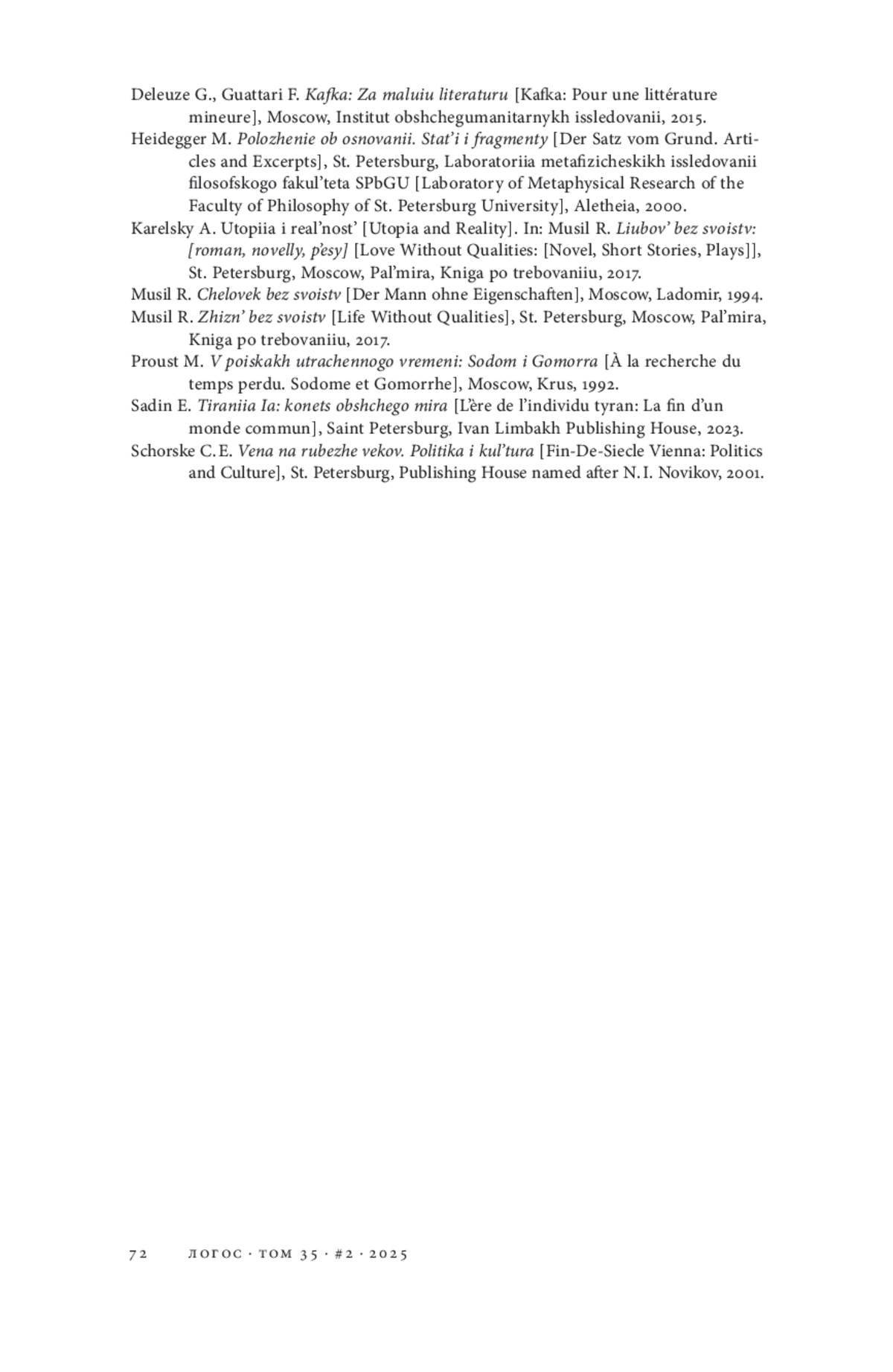 13. Карельский А. В. Утопия и реальность // Музиль Р. Любовь без свойств: [роман, новеллы, пьесы] / Пер. с нем. С. К. Апта, И. С. Алексеевой, Н. Н. Федоровой. СПб.; М.: Пальмира; Книга по требованию, 2017.