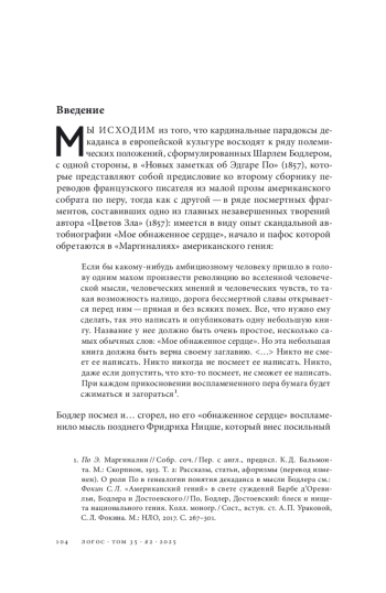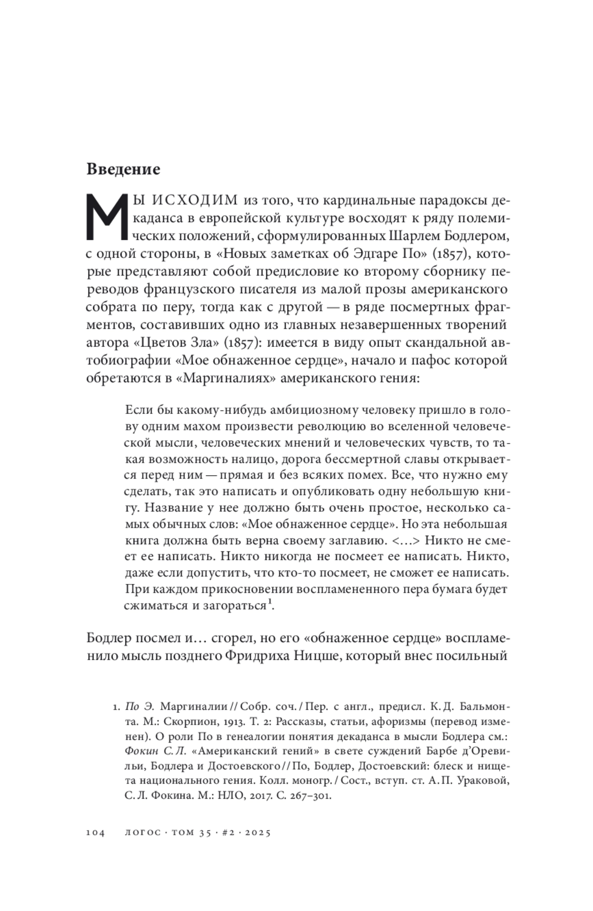 Мы сходим из того, что кардинальные парадоксы декаданса в европейской культуре восходят к ряду полемических положений, сформулированных Шарлем Бодлером, с одной стороны, в «Новых заметках об Эдгаре По» (1857), которые представляют собой предисловие ко второму сборнику переводов французского писателя из малой прозы американского собрата по перу, тогда как с другой— в ряде посмертных фрагментов, составивших одно из главных незавершенных творений автора «Цветов Зла» (1857): имеется в виду опыт скандальной автобиографии «Мое обнаженное сердце», начало и пафос которой обретаются в «Маргиналиях» американского гения