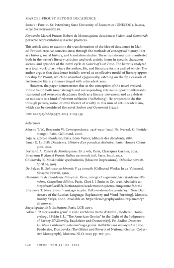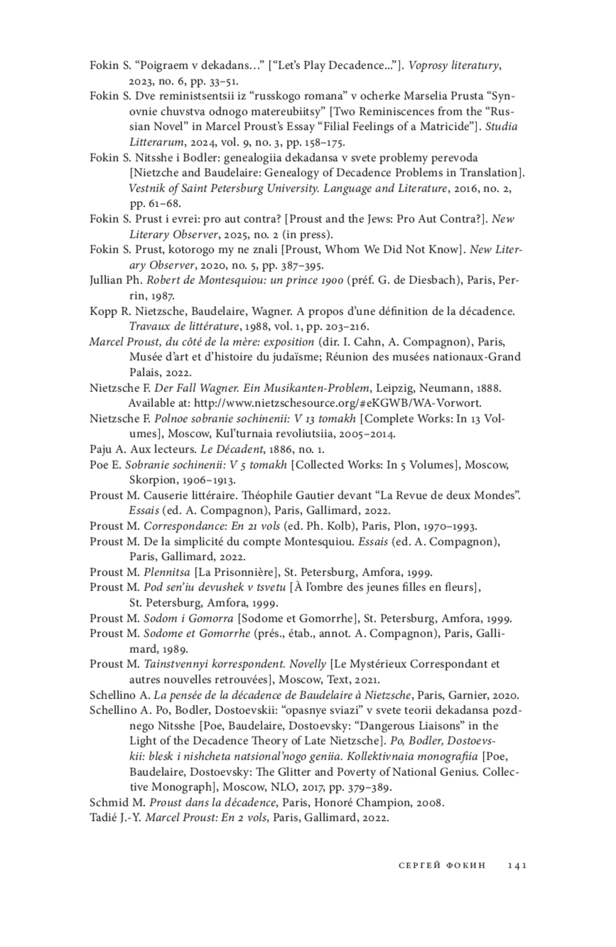13. Фокин С. Л. Две реминисценции из “русского романа” в очерке Марселя Пруста “Сыновние чувства одного матереубийцы” // Studia Litterarum. 2024. Т. 9. № 3. С. 158-175. EDN: MFUKAK