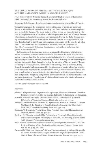 21. Carnevali B. “Être, c’est être perçu”: Ce que Proust enseigne à la philosophie sociale // Le travail de la littérature. Usages du littéraire en philosophie / D. Lorenzini, A. Revel (dir.). Rennes: Presses Universitaires de Rennes, 2012. P. 39-51.