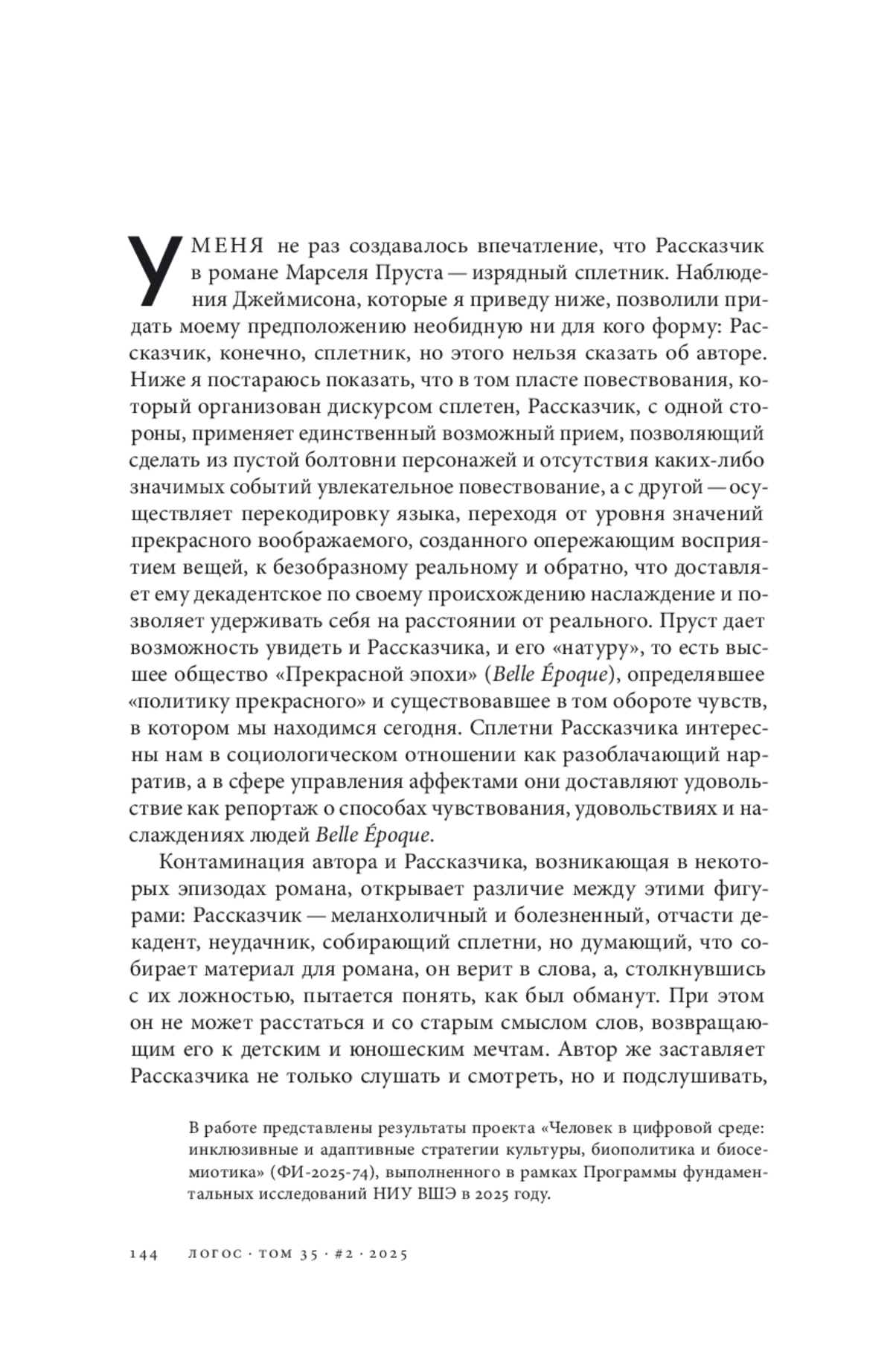 У меня не раз создавалось впечатление, что Рассказчик в романе Марселя Пруста — изрядный сплетник. Наблюдения Джеймисона, которые я приведу ниже, позволили придать моему предположению необидную ни для кого форму: Рассказчик, конечно, сплетник, но этого нельзя сказать об авторе. Ниже я постараюсь показать, что в том пласте повествования, который организован дискурсом сплетен, Рассказчик, с одной стороны, применяет единственный возможный прием, позволяющий сделать из пустой болтовни персонажей и отсутствия каких-либо значимых событий увлекательное повествование, а с другой — осуществляет перекодировку языка, переходя от уровня значений прекрасного воображаемого, созданного опережающим восприятием вещей, к безобразному реальному и обратно, что доставляет ему декадентское по своему происхождению наслаждение и позволяет удерживать себя на расстоянии от реального. Пруст дает возможность увидеть и Рассказчика, и его «натуру», то есть высшее общество «Прекрасной эпохи» (Belle Époque), определявшее «политику прекрасного» и существовавшее в том обороте чувств, в котором мы находимся сегодня. Сплетни Рассказчика интересны нам в социологическом отношении как разоблачающий нарратив, а в сфере управления аффектами они доставляют удовольствие как репортаж о способах чувствования, удовольствиях и наслаждениях людей Belle Époque