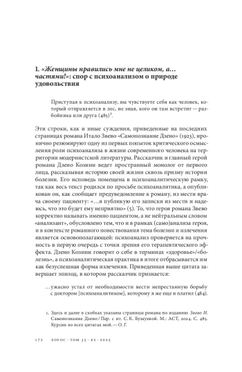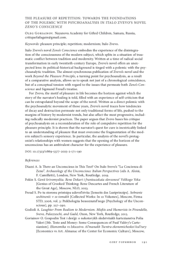 В романе Итало Звево «Самопознание Дзено» воплощается опыт распада сознания модерного субъекта, которое раскалывается в ситуации травматического конфликта между традицией и современностью. Написанный в эпоху радикальных социальных трансформаций в Европе начала ХХ века, роман Звево предлагает неожиданную оптику: политико-исторический фон в нем оттенен полемикой с психоаналитической традицией. Сравнительный анализ почти синхронно вышедших романа Звево и поворотной для психоанализа работы «По ту сторону принципа удовольствия» позволяет говорить не просто о хронологическом совпадении, а о концептуальном напряжении в отношении той проблематики, которая пронизывает как роман «Самопознание Дзено», так и трактат Зигмунда Фрейда. Мотив удовольствия от жизни становится для Звево горизонтом, на фоне которого рассказывается история исцеления рассказчика, наполненная опытом самокритики, который может быть экстраполирован за рамки романа. Написанный в форме прямой полемики с психоаналитическим движением тех лет, роман Звево позволяет проследить за тем, как тенденции распада и деструкции пронизывают не только традиционные формы жизни, оттесняемые на обочину истории модерными веяниями, но и затрагивает самые прогрессивные, в том числе радикально модернистские, практики. В статье выдвигается тезис, что Звево строит свою критику психоанализа на основе пересмотра роли навязчивых повторений для принципа удовольствия. Показывается, что стремление рассказчика к излечению неразрывно связано с таким пониманием удовольствия, которое должно преодолевать фрагментарность чувственного опыта модерного субъекта. В частности, анализ отношений героя романа с женщинами позволяет предположить, что открытие горизонта бессознательного носит амбивалентный характер для опыта удовольствия.