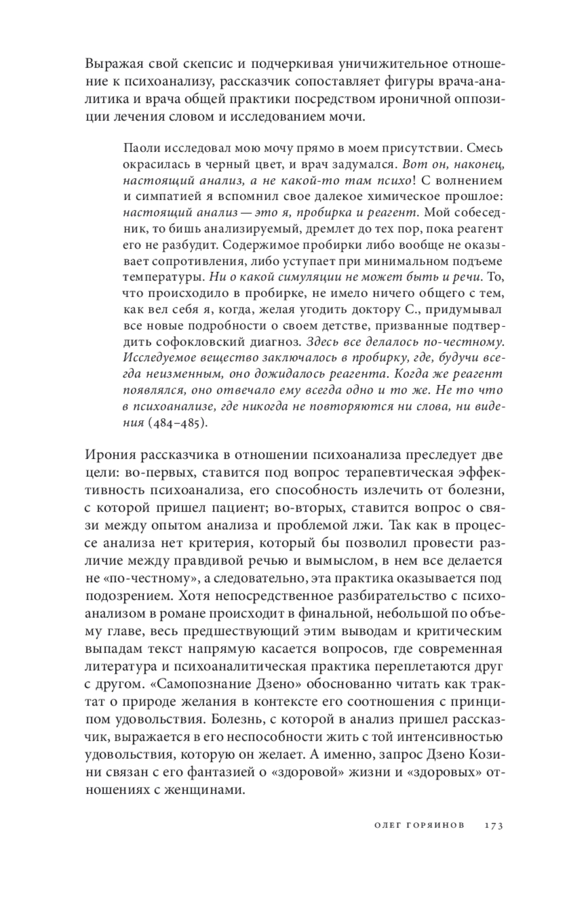 Эти строки, как и иные суждения, приведенные на последних страницах романа Итало Звево «Самопознание Дзено» (1923), иронично резюмируют одну из первых попыток критического осмысления роли психоанализа в жизни современного человека на территории модернистской литературы. Рассказчик и главный герой романа Дзено Козини ведет пространный монолог от первого лица, рассказывая историю своей жизни сквозь призму истории болезни. Его исповедь помещена в психоаналитическую рамку, так как весь текст родился по просьбе психоаналитика, а опубликован он, как сообщает предуведомление к роману, из мести врача своему пациенту: «… я публикую его записки из мести и надеюсь, что это будет ему неприятно»