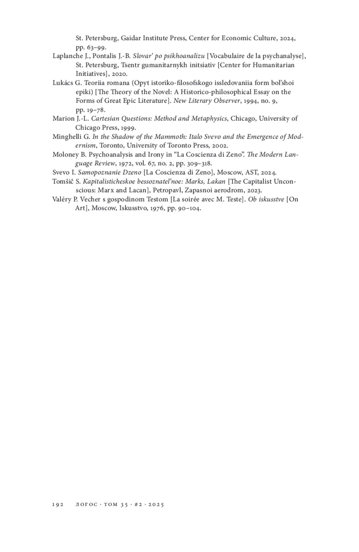 13. Moloney B. Psychoanalysis and Irony in “La Coscienza di Zeno” // The Modern Language Review. 1972. Vol. 67. № 2. P. 309-318.