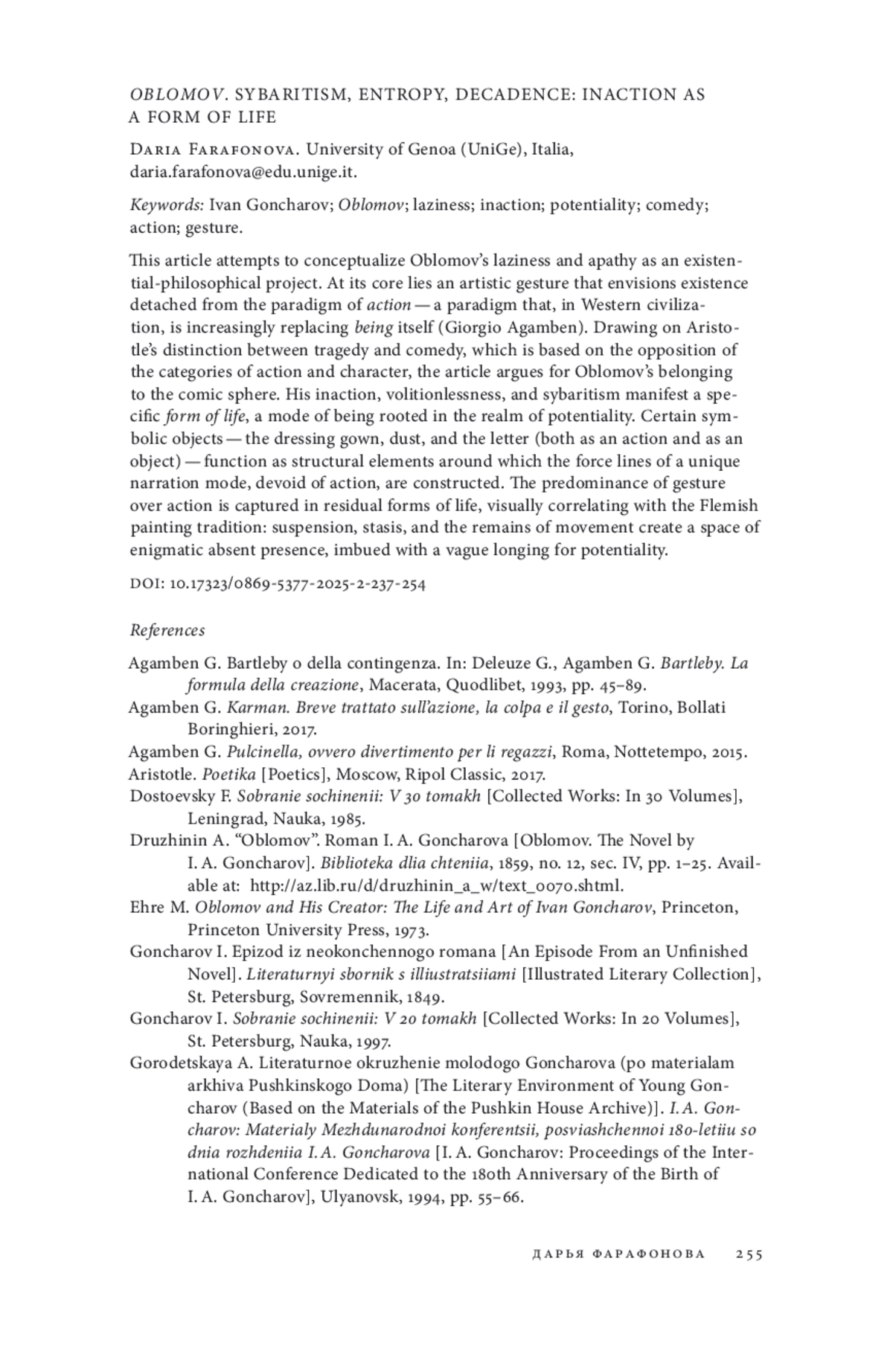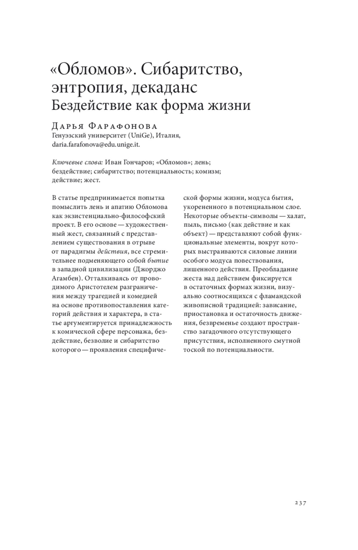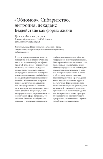 В статье предпринимается попытка помыслить лень и апатию Обломова как экзистенциально-философский проект. В его основе — художественный жест, связанный с представлением существования в отрыве от парадигмы действия, все стремительнее подменяющего собой бытие в западной цивилизации (Джорджо Агамбен). Отталкиваясь от проводимого Аристотелем разграничения между трагедией и комедией на основе противопоставления категорий действия и характера, в статье аргументируется принадлежность к комической сфере персонажа, бездействие, безволие и сибаритство которого — проявления специфической формы жизни, модуса бытия, укорененного в потенциальном слое. Некоторые объекты-символы — халат, пыль, письмо (как действие и как объект) — представляют собой функциональные элементы, вокруг которых выстраиваются силовые линии особого модуса повествования, лишенного действия. Преобладание жеста над действием фиксируется в остаточных формах жизни, визуально соотносящихся с фламандской живописной традицией: зависание, приостановка и остаточность движения, безвременье создают пространство загадочного отсутствующего присутствия, исполненного смутной тоской по потенциальности