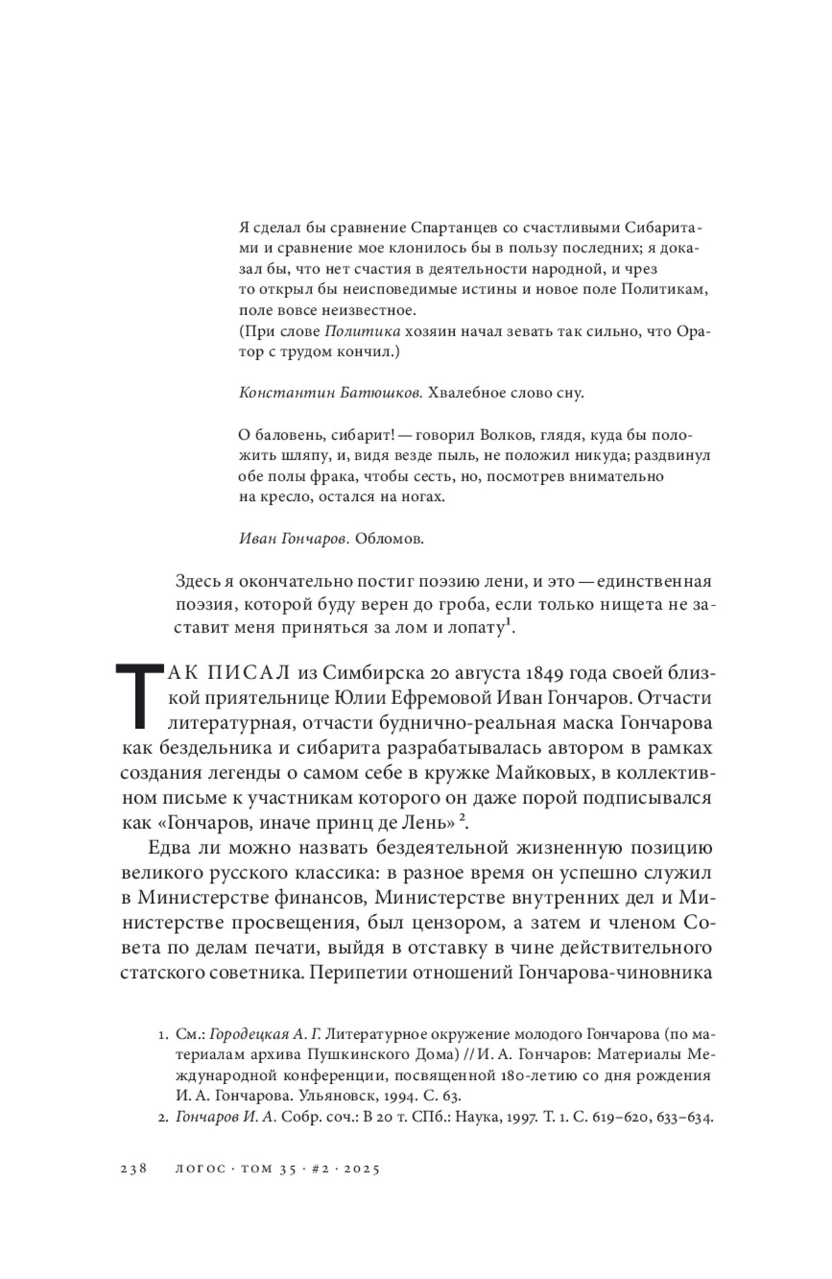 Так писал из Симбирска 20 августа 1849 года своей близкой приятельнице Юлии Ефремовой Иван Гончаров. Отчасти литературная, отчасти буднично-реальная маска Гончарова как бездельника и сибарита разрабатывалась автором в рамках создания легенды о самом себе в кружке Майковых, в коллективном письме к участникам которого он даже порой подписывался как «Гончаров, иначе принц де Лень»