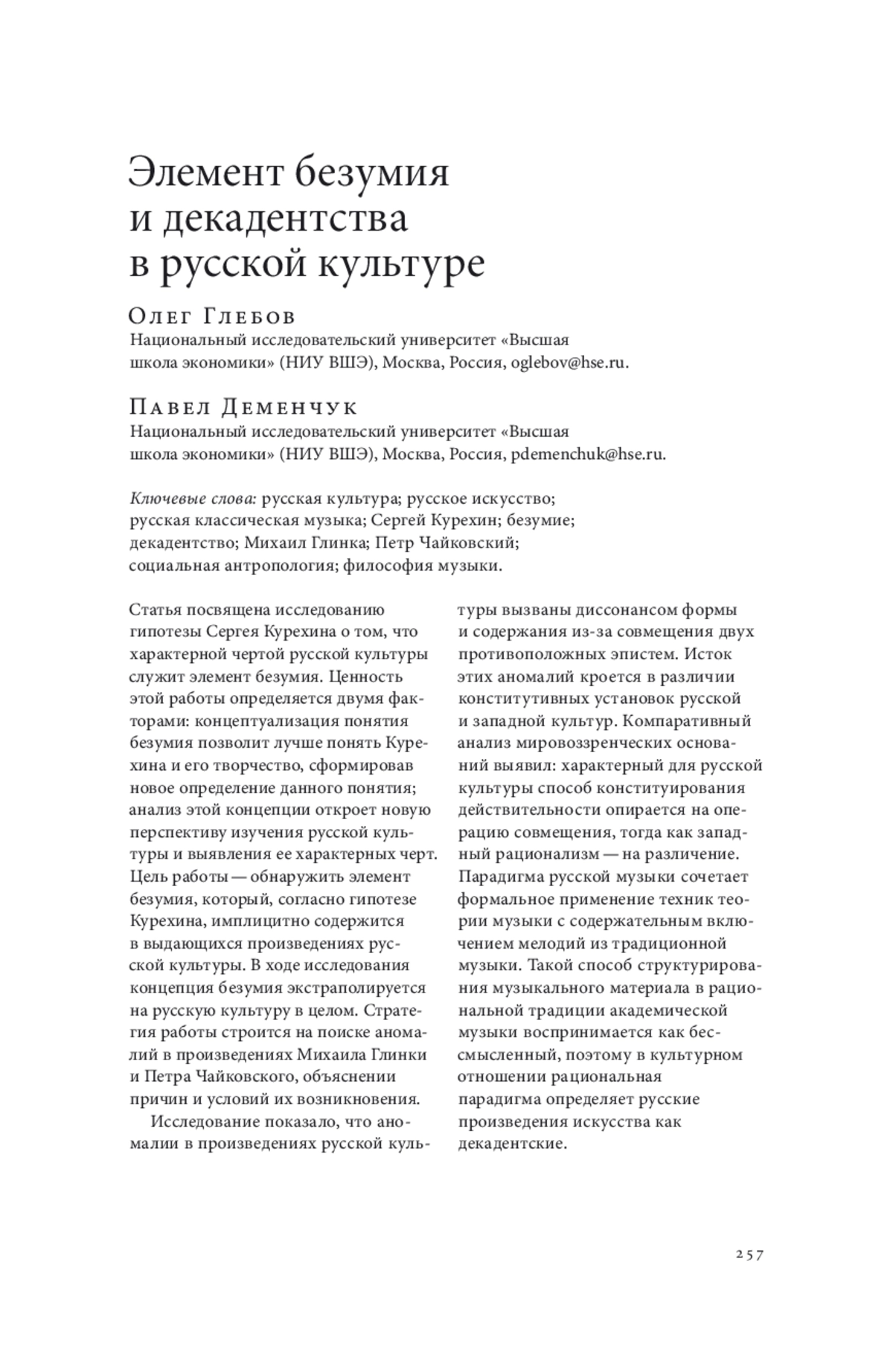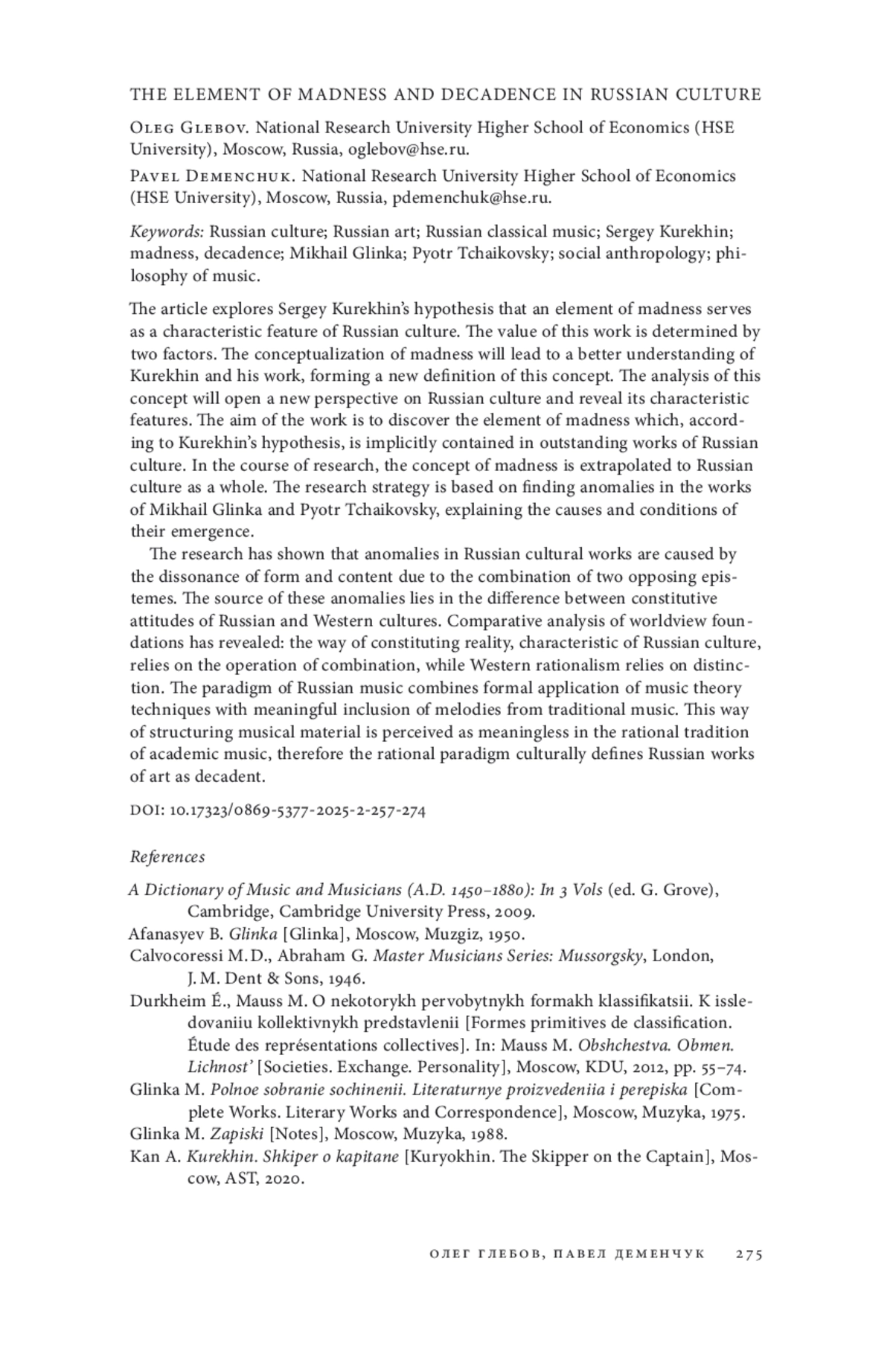 Статья посвящена исследованию гипотезы Сергея Курехина о том, что характерной чертой русской культуры служит элемент безумия. Ценность этой работы определяется двумя факторами: концептуализация понятия безумия позволит лучше понять Курехина и его творчество, сформировав новое определение данного понятия; анализ этой концепции откроет новую перспективу изучения русской культуры и выявления ее характерных черт. Цель работы — обнаружить элемент безумия, который, согласно гипотезе Курехина, имплицитно содержится в выдающихся произведениях русской культуры. В ходе исследования концепция безумия экстраполируется на русскую культуру в целом. Стратегия работы строится на поиске аномалий в произведениях Михаила Глинки и Петра Чайковского, объяснении причин и условий их возникновения. Исследование показало, что аномалии в произведениях русской культуры вызваны диссонансом формы и содержания из-за совмещения двух противоположных эпистем. Исток этих аномалий кроется в различии конститутивных установок русской и западной культур. Компаративный анализ мировоззренческих оснований выявил: характерный для русской культуры способ конституирования действительности опирается на операцию совмещения, тогда как западный рационализм — на различение. Парадигма русской музыки сочетает формальное применение техник теории музыки с содержательным включением мелодий из традиционной музыки. Такой способ структурирования музыкального материала в рациональной традиции академической музыки воспринимается как бессмысленный, поэтому в культурном отношении рациональная парадигма определяет русские произведения искусства как декадентские