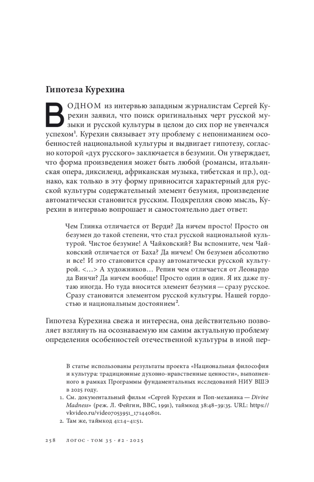 В одном из интервью западным журналистам Сергей Курехин заявил, что поиск оригинальных черт русской музыки и русской культуры в целом до сих пор не увенчался успехом1. Курехин связывает эту проблему с непониманием особенностей национальной культуры и выдвигает гипотезу, согласно которой «дух русского» заключается в безумии. Он утверждает, что форма произведения может быть любой (романсы, итальянская опера, диксиленд, африканская музыка, тибетская и пр.), однако, как только в эту форму привносится характерный для русской культуры содержательный элемент безумия, произведение автоматически становится русским. Подкрепляя свою мысль, Курехин в интервью вопрошает и самостоятельно дает ответ
