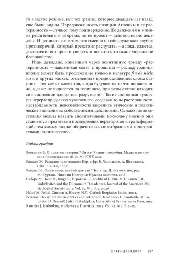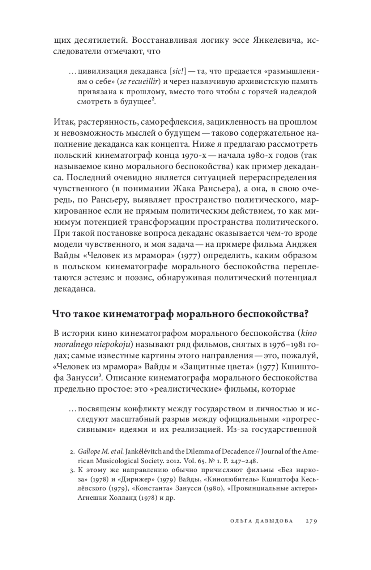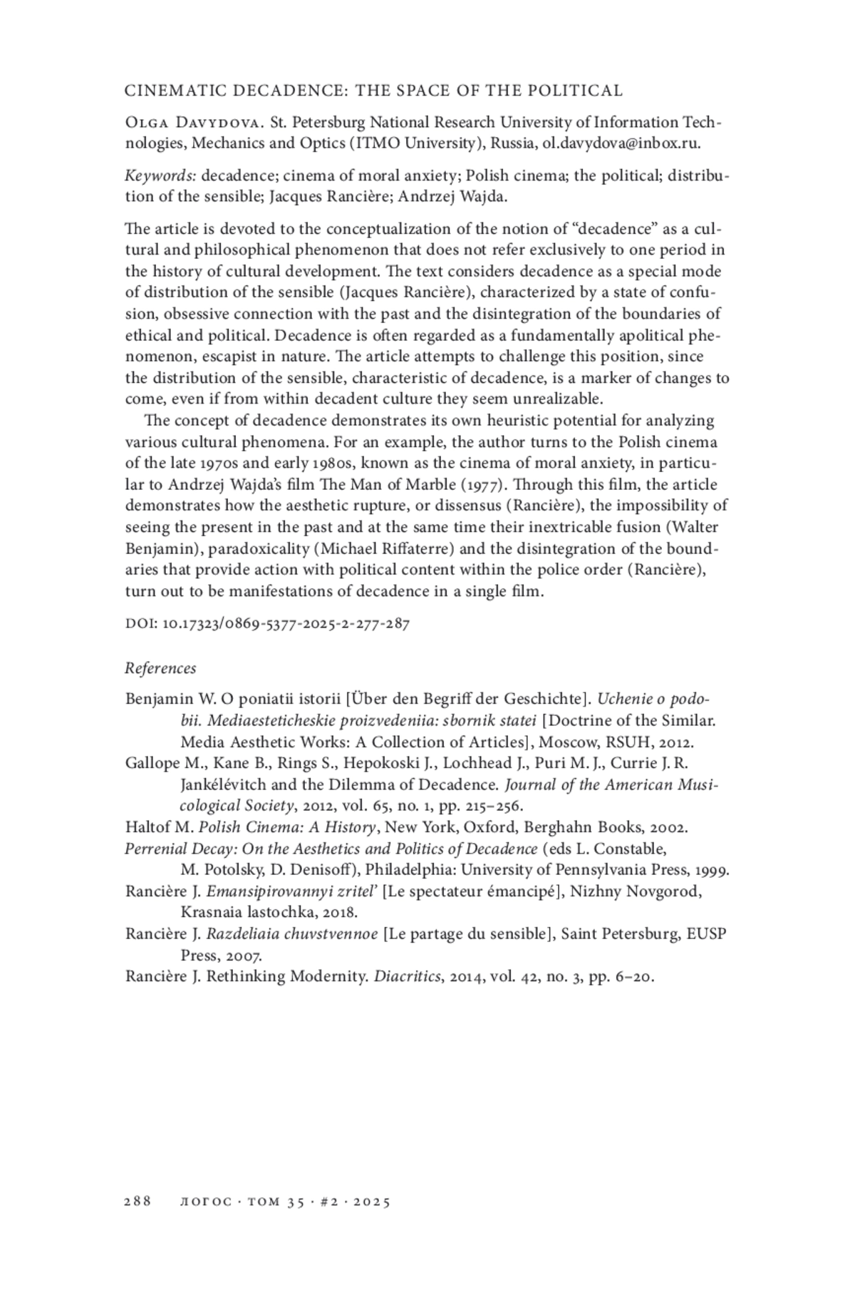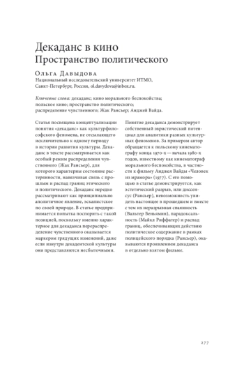 Статья посвящена концептуализации понятия «декаданс» как культурфилософского феномена, не отсылающего исключительно к одному периоду в истории развития культуры. Декаданс в тексте рассматривается как особый режим распределения чувственного (Жак Рансьер), для которого характерны состояние растерянности, навязчивая связь с прошлым и распад границ этического и политического. Декаданс нередко рассматривают как принципиально аполитичное явление, эскапистское по своей природе. В статье предпринимается попытка поспорить с такой позицией, поскольку именно характерное для декаданса перераспределение чувственного оказывается маркером грядущих изменений, даже если изнутри декадентской культуры они представляются несбыточными. Понятие декаданса демонстрирует собственный эвристический потенциал для аналитики разных культурных феноменов. За примером автор обращается к польскому кинематографу конца 1970-х — начала 1980-х годов, известному как кинематограф морального беспокойства, в частности к фильму Анджея Вайды «Человек из мрамора» (1977). С его помощью в статье демонстрируется, как эстетический разрыв, или диссенсус (Рансьер), невозможность увидеть настоящее в прошедшем и вместе с тем их неразрывная спаянность (Вальтер Беньямин), парадоксальность (Майкл Риффатер) и распад границ, обеспечивающих действию политическое содержание в рамках полицейского порядка (Рансьер), оказываются проявлением декаданса в отдельно взятом фильме