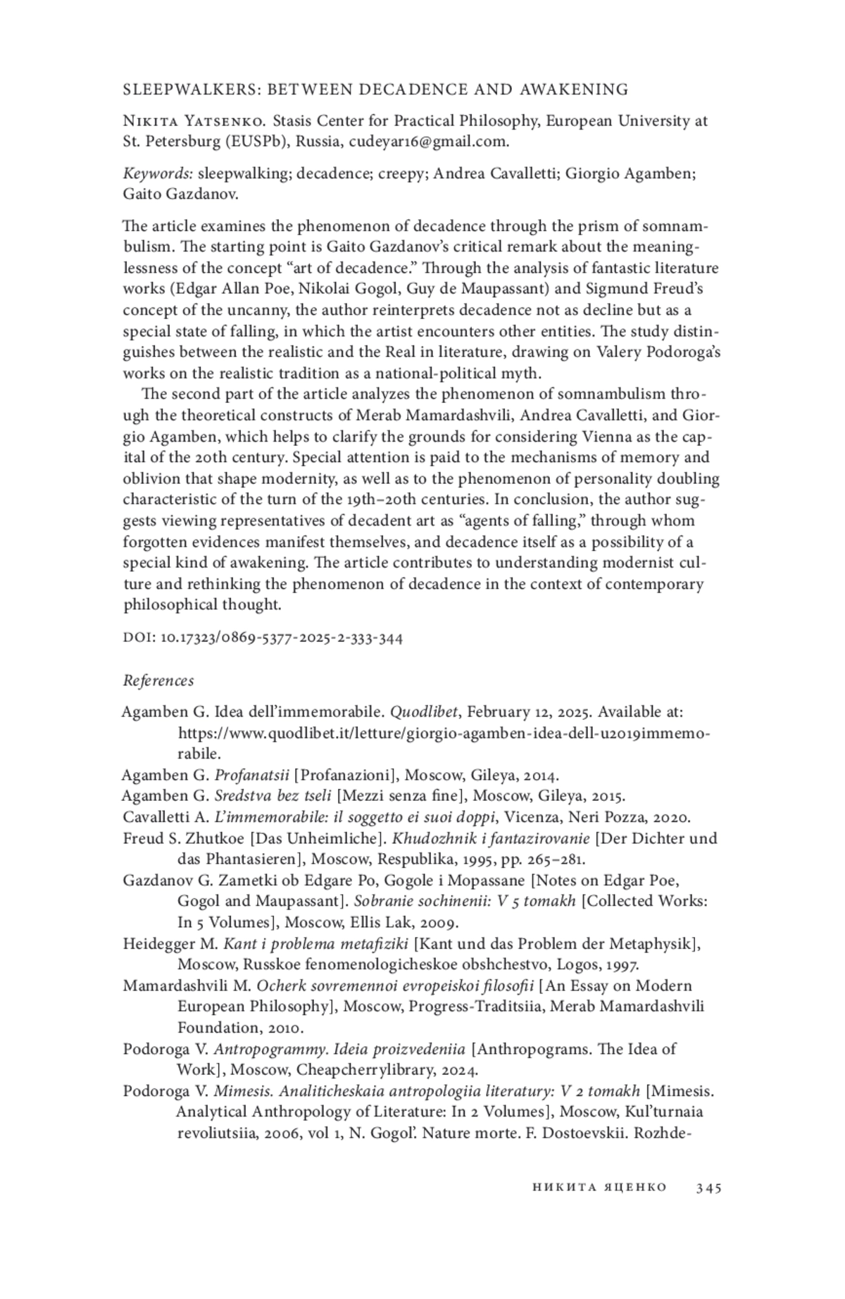 В статье исследуется феномен декаданса через призму сомнамбулизма. Отправной точкой служит критическое замечание Гайто Газданова о бессмысленности понятия «искусство декаданса». Через анализ работ фантастической литературы (Эдгар Аллан По, Николай Гоголь, Ги де Мопассан) и концепцию жуткого Зигмунда Фрейда автор переосмысливает декаданс не как упадок, а как особое состояние впадения, в котором художник встречается с иными сущностями. Исследование проводит различие между реалистическим и Реальным в литературе, опираясь на работы Валерия Подороги о реалистической традиции как национально-политическом мифе. Во второй части статьи анализируется феномен сомнамбулизма через теоретические построения Мераба Мамардашвили, Андреа Каваллетти и Джорджо Агамбена, что позволяет прояснить основания, по которым Вена считается столицей XX века. Особое внимание уделяется механизмам памяти и забвения, формирующим современность, а также феномену удвоения личности, характерному для рубежа XIX–XX веков. В заключение автор предлагает рассматривать представителей искусства декаданса как «агентов впадения», через которых проявляются забытые очевидности, а сам декаданс — как возможность особого рода пробуждения. Статья вносит вклад в понимание модернистской культуры и переосмысление феномена декаданса в контексте современной философской мысли