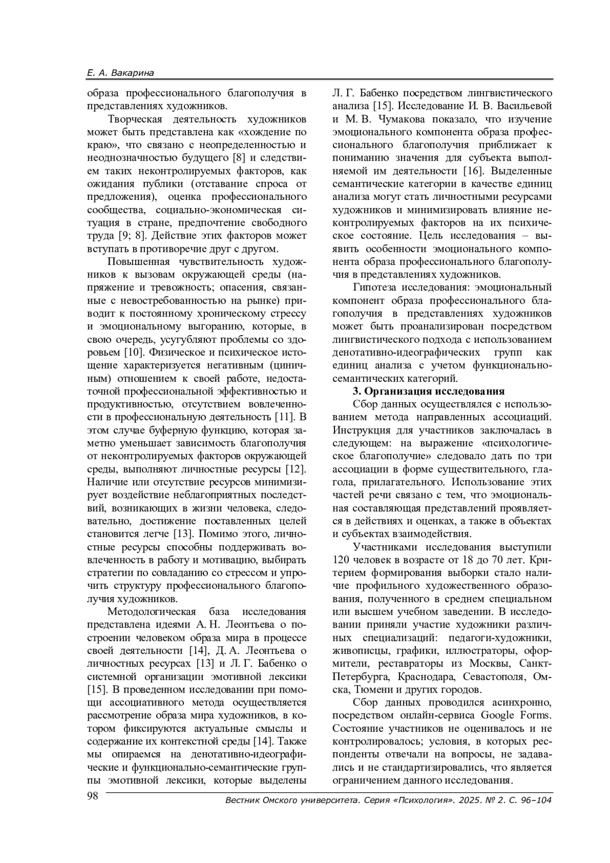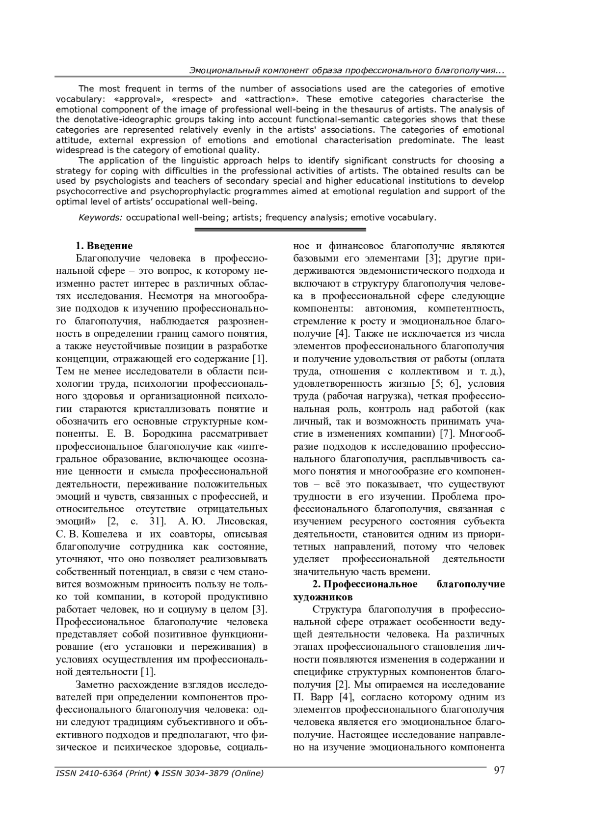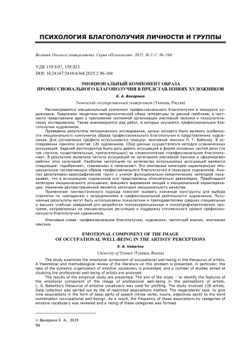 Приведены результаты эмпирического исследования, целью которого было выявить особенности эмоционального компонента образа профессионального благополучия в представлениях художников. Для составления профиля использовался тезаурус эмотивной лексики Л. Г. Бабенко. В исследовании приняли участие 120 художников. Сбор данных осуществлялся методом ограниченных ассоциаций. Задачей респондентов было дать девять ассоциаций в форме основных частей речи (по три глагола, существительных, прилагательных) на словосочетание «профессиональное благополучие». В результате выявлена частота ассоциаций по категориям эмотивной лексики и сформирован рейтинг этих категорий. Наиболее частотными по количеству используемых ассоциаций являются следующие: «одобрение», «уважение» и «влечение». Эти эмотивные категории характеризуют эмоциональную составляющую образа профессионального благополучия в тезаурусе художников. Анализ денотативно-идеографических групп с учетом функционально-семантических категорий показывает, что в ассоциациях художников они представлены относительно равномерно. Преобладают категории эмоционального отношения, внешнего выражения эмоций и эмоциональной характеризации. Наименее распространенной является категория эмоционального качества.