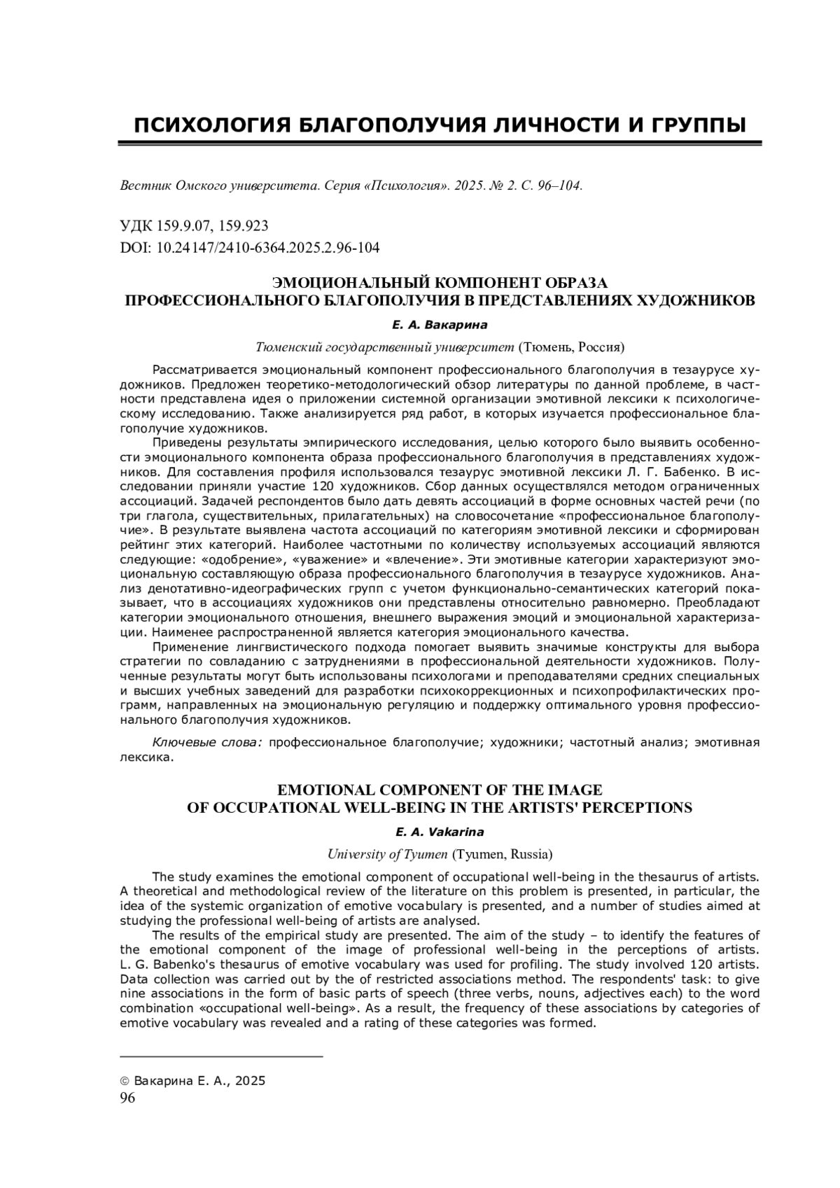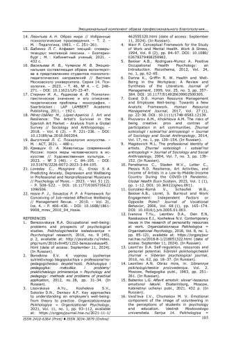 Рассматривается эмоциональный компонент профессионального благополучия в тезаурусе художников. Предложен теоретико-методологический обзор литературы по данной проблеме, в частности представлена идея о приложении системной организации эмотивной лексики к психологическому исследованию. Также анализируется ряд работ, в которых изучается профессиональное благополучие художников.