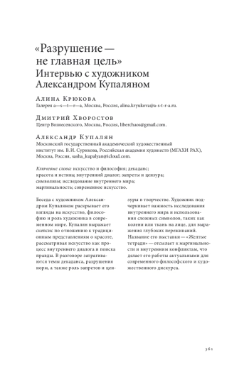 Беседа с художником Александром Купаляном раскрывает его взгляды на искусство, философию и роль художника в современном мире. Купалян выражает скепсис по отношению к традиционным представлениям о красоте, рассматривая искусство как процесс внутреннего диалога и поиска правды. В разговоре затрагиваются темы декаданса, разрушения норм, а также роль запретов и цензуры в творчестве. Художник подчеркивает важность исследования внутреннего мира и использования сложных символов, таких как колени или ткань на лице, для выражения глубоких переживаний. Название его выставки — «Желтые тетради» — отсылает к маргинальности и внутренним конфликтам, что делает его работы актуальными для современного философского и художественного дискурса.