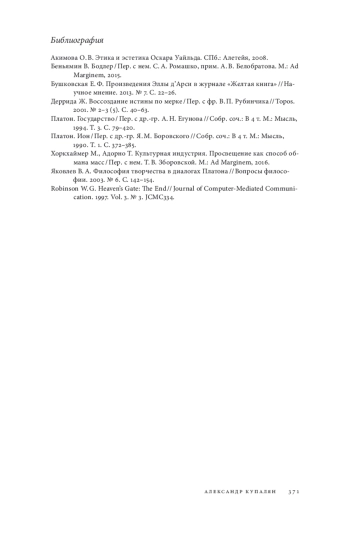 1. Акимова О. В. Этика и эстетика Оскара Уайльда. СПб.: Алетейя, 2008. EDN: QTQERR