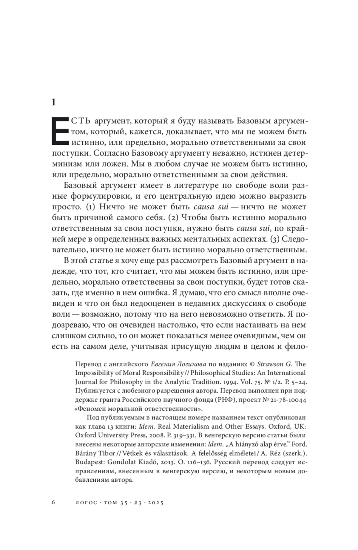 Есть аргумент, который я буду называть Базовым аргументом, который, кажется, доказывает, что мы не можем быть истинно, или предельно, морально ответственными за свои поступки. Согласно Базовому аргументу неважно, истинен детерминизм или ложен. Мы в любом случае не можем быть истинно, или предельно, морально ответственными за свои действия