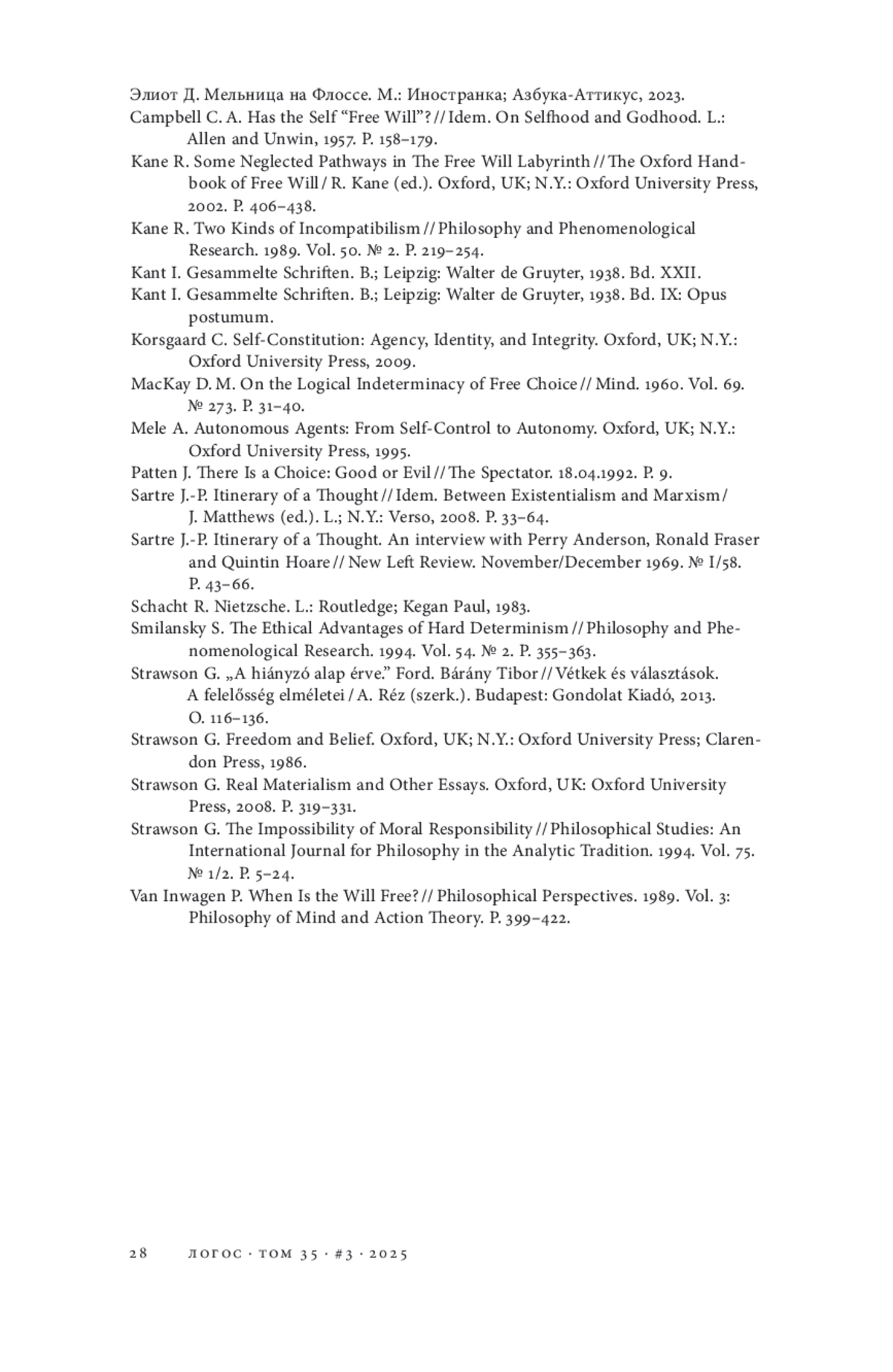 12. Kane R. Two Kinds of Incompatibilism // Philosophy and Phenomenological Research. 1989. Vol. 50. № 2. P. 219-254.