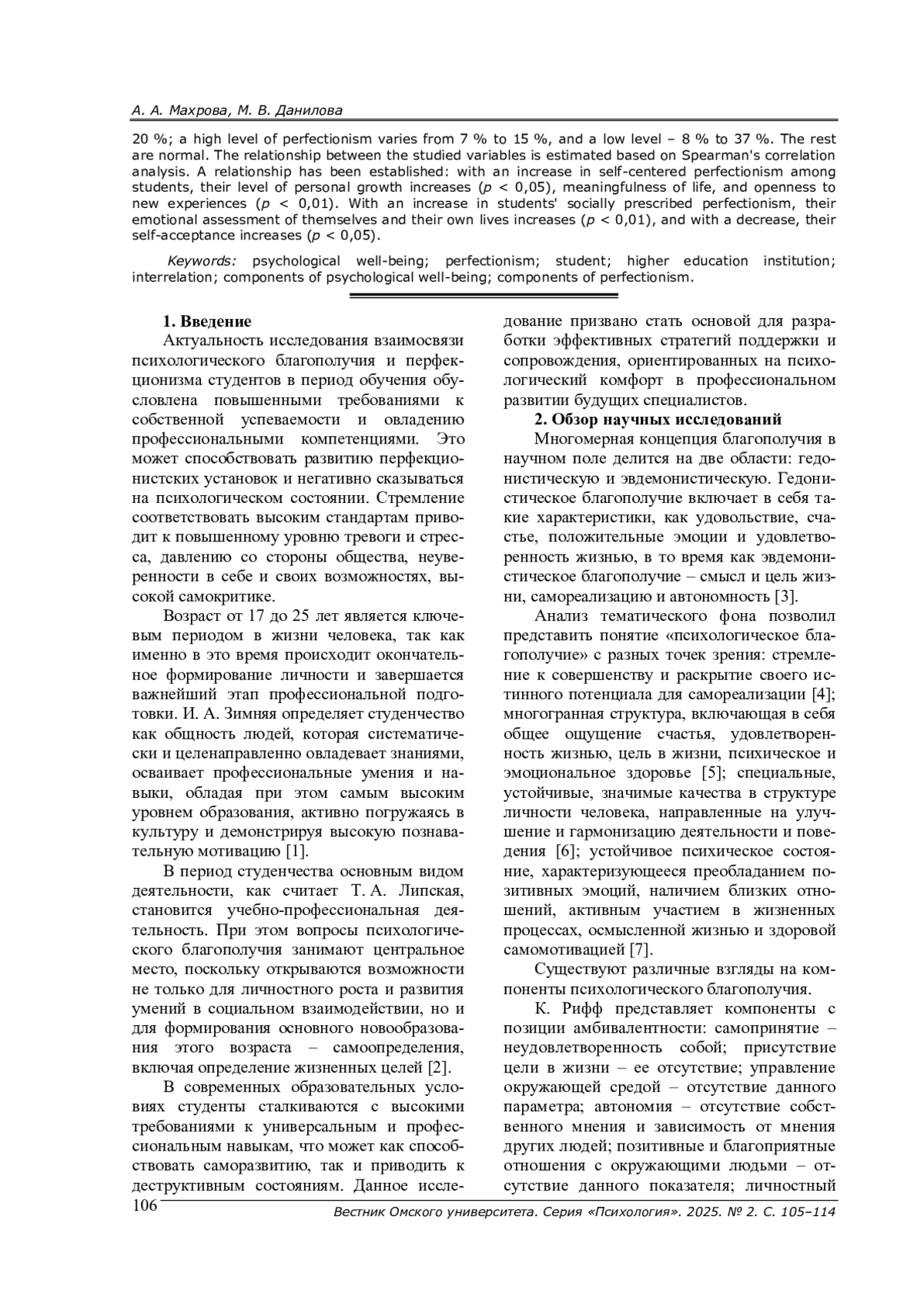 29. Михеева Л. А. Перфекционизм и психологическое благополучие как корреляты ответственности личности в период ранней взрослости // Социальная, профессиональная и персональная ответственность личности в современном обществе: материалы Всероссийской научно-практической конференции с международным участием (Омск, 8-10 октября 2020 г.). - Омск: Издательство Омского государственного университета им. Ф. М. Достоевского, 2020. - С. 589-592. EDN: KWZDZC