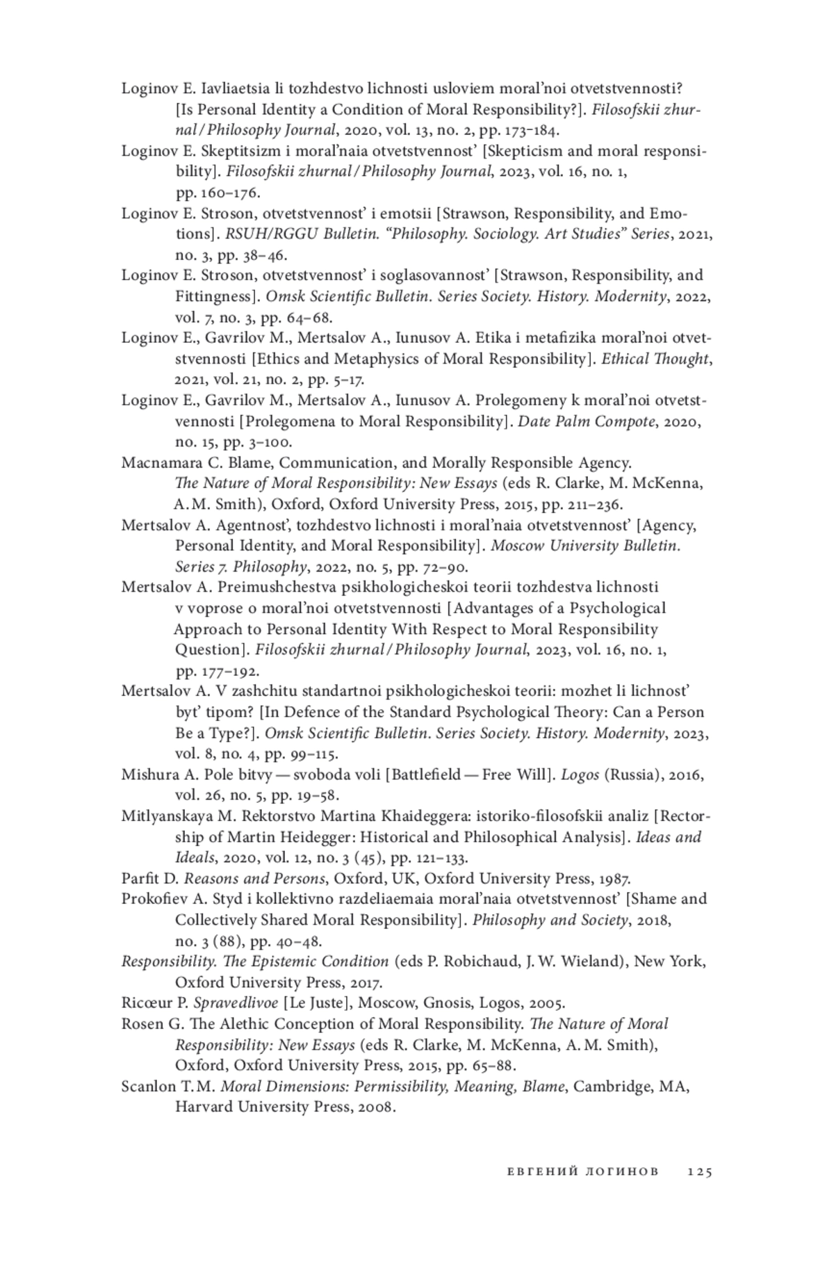 23. Логинов Е. В., Гаврилов М. В., Мерцалов А. В., Юнусов А. Т. Этика и метафизика моральной ответственности // Этическая мысль. 2021. Т. 21. № 2. С. 5-17. EDN: CPUOGJ