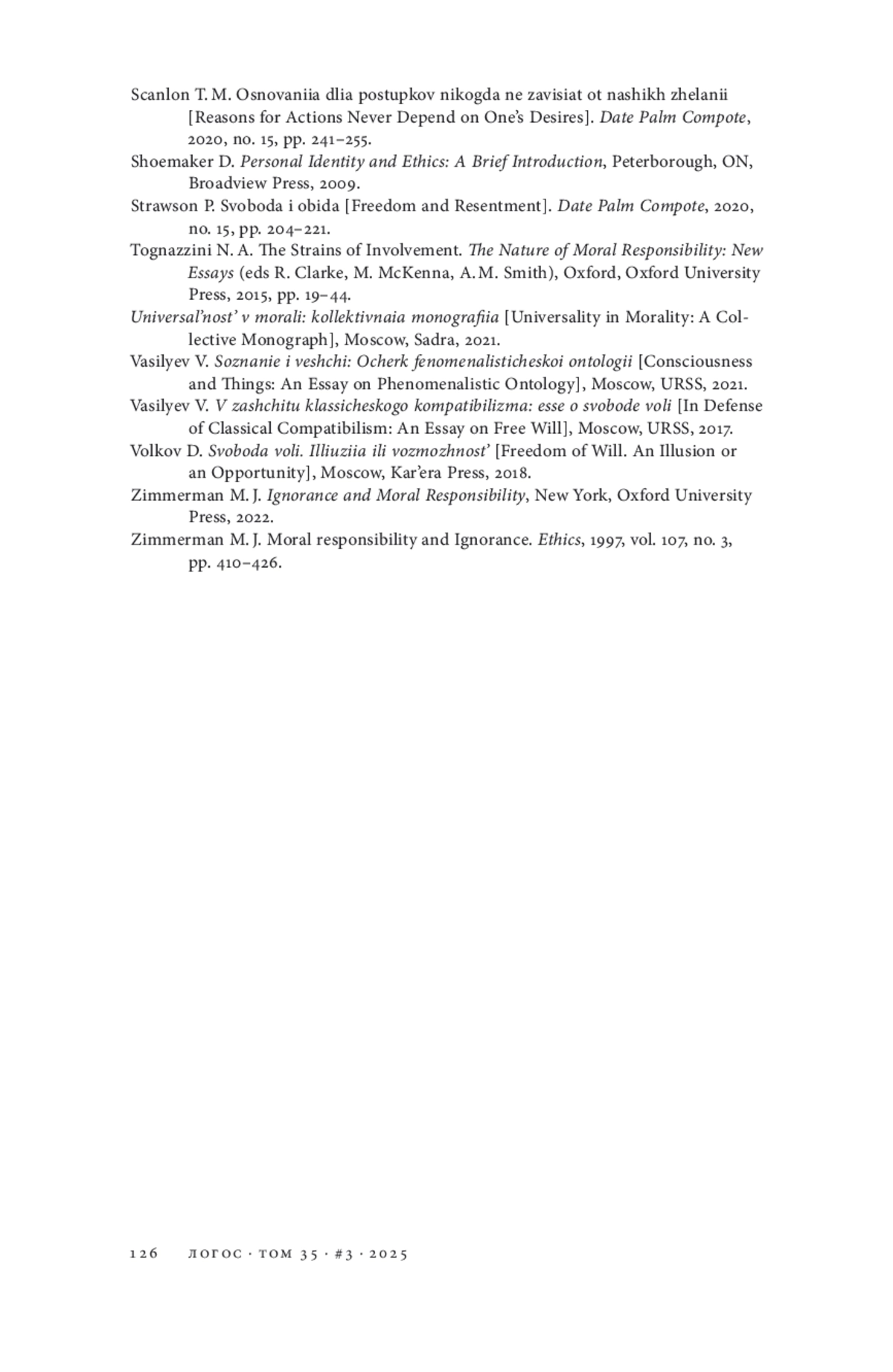48. Zimmerman M. J. Moral responsibility and Ignorance // Ethics. 1997. Vol. 107. № 3. P. 410-426. EDN: HHFJXN