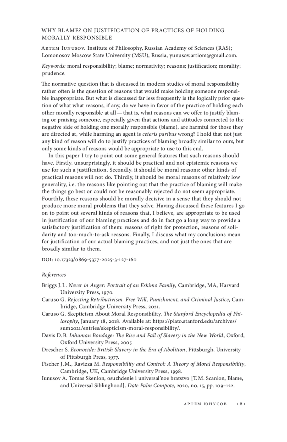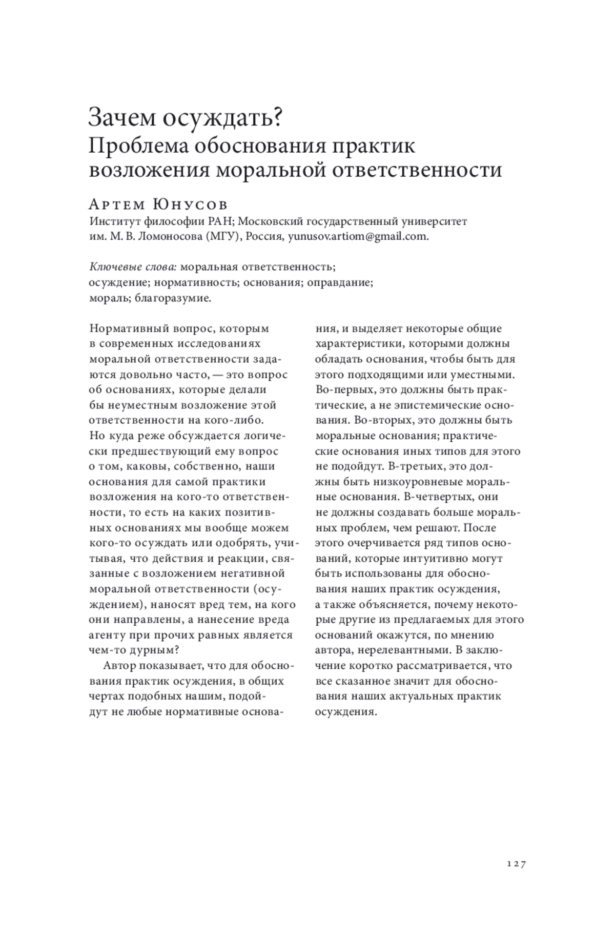 Нормативный вопрос, которым в современных исследованиях моральной ответственности задаются довольно часто, — это вопрос об основаниях, которые делали бы неуместным возложение этой ответственности на кого-либо. Но куда реже обсуждается логически предшествующий ему вопрос о том, каковы, собственно, наши основания для самой практики возложения на кого-то ответственности, то есть на каких позитивных основаниях мы вообще можем кого-то осуждать или одобрять, учитывая, что действия и реакции, связанные с возложением негативной моральной ответственности (осуждением), наносят вред тем, на кого они направлены, а нанесение вреда агенту при прочих равных является чем-то дурным? Автор показывает, что для обоснования практик осуждения, в общих чертах подобных нашим, подойдут не любые нормативные основания, и выделяет некоторые общие характеристики, которыми должны обладать основания, чтобы быть для этого подходящими или уместными. Во-первых, это должны быть практические, а не эпистемические основания. Во-вторых, это должны быть моральные основания; практические основания иных типов для этого не подойдут. В-третьих, это должны быть низкоуровневые моральные основания. В-четвертых, они не должны создавать больше моральных проблем, чем решают. После этого очерчивается ряд типов оснований, которые интуитивно могут быть использованы для обоснования наших практик осуждения, а также объясняется, почему некоторые другие из предлагаемых для этого оснований окажутся, по мнению автора, нерелевантными. В заключение коротко рассматривается, что все сказанное значит для обоснования наших актуальных практик осуждения
