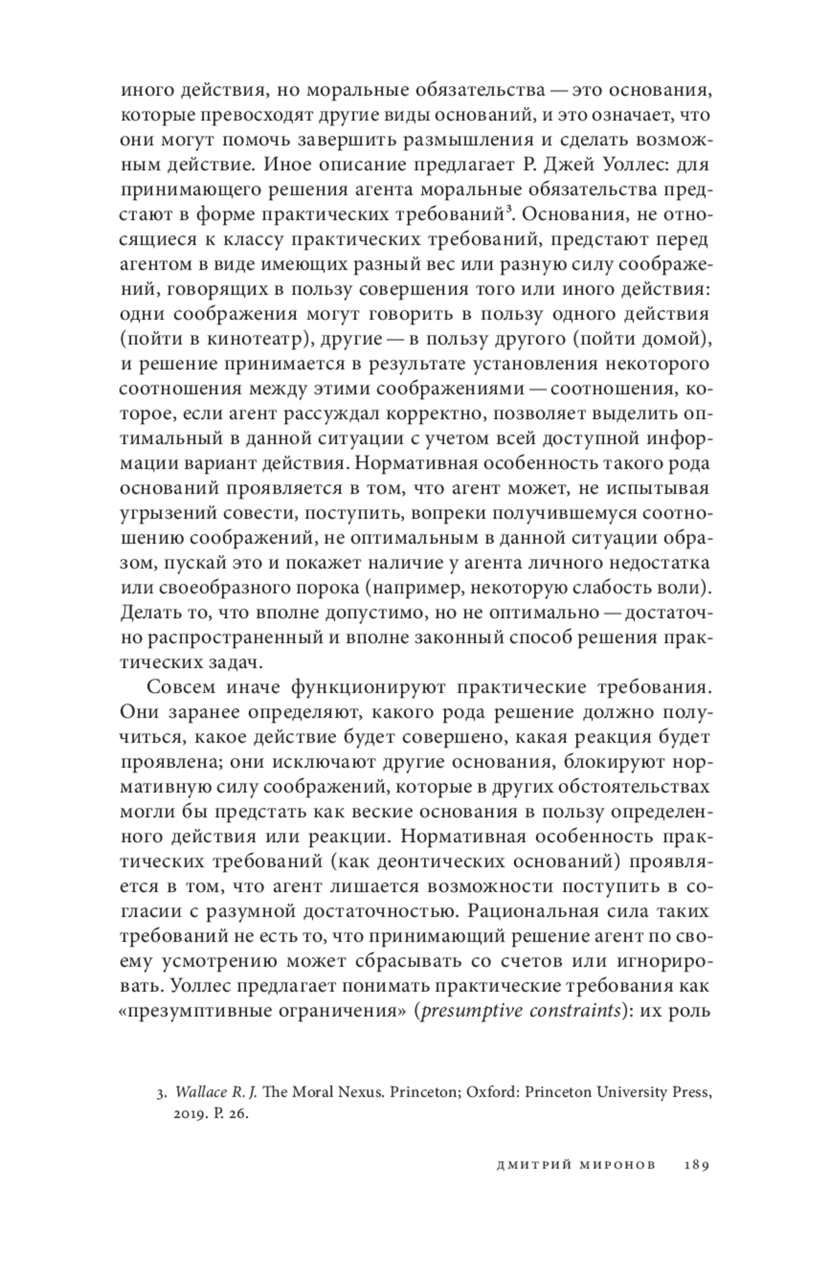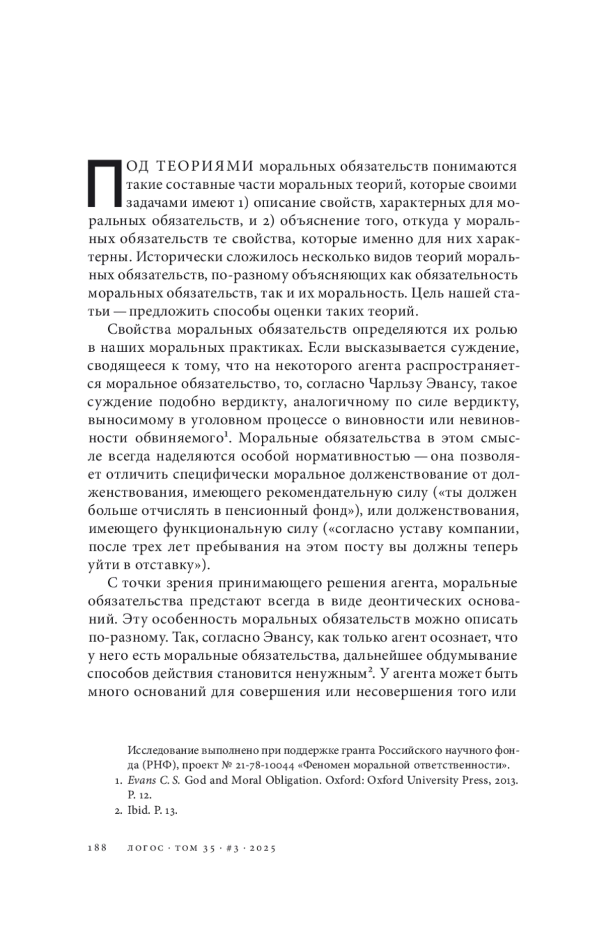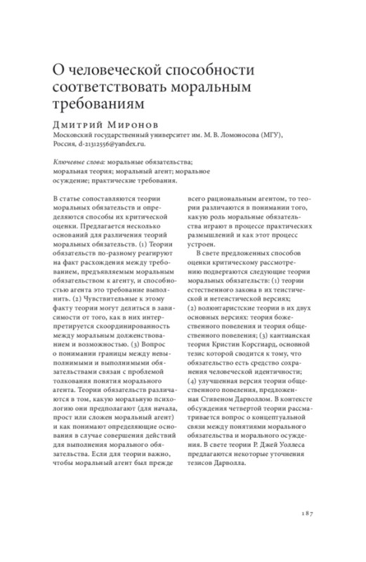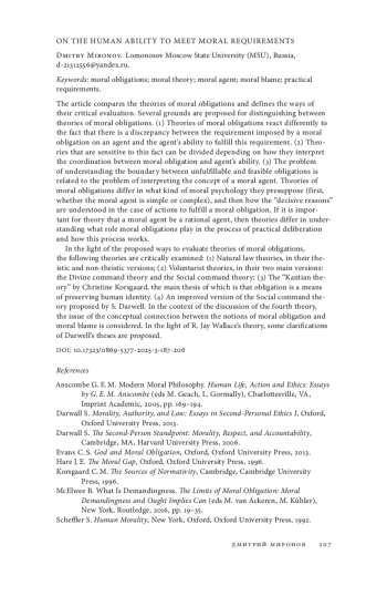 В статье сопоставляются теории моральных обязательств и определяются способы их критической оценки. Предлагается несколько оснований для различения теорий моральных обязательств. (1) Теории обязательств по-разному реагируют на факт расхождения между требованием, предъявляемым моральным обязательством к агенту, и способностью агента это требование выполнить. (2) Чувствительные к этому факту теории могут делиться в зависимости от того, как в них интерпретируется скоординированность между моральным долженствованием и возможностью. (3) Вопрос о понимании границы между невыполнимыми и выполнимыми обязательствами связан с проблемой толкования понятия морального агента. Теории обязательств различаются в том, какую моральную психологию они предполагают (для начала, прост или сложен моральный агент) и как понимают определяющие основания в случае совершения действий для выполнения морального обязательства. Если для теории важно, чтобы моральный агент был прежде всего рациональным агентом, то теории различаются в понимании того, какую роль моральные обязательства играют в процессе практических размышлений и как этот процесс устроен. В свете предложенных способов оценки критическому рассмотрению подвергаются следующие теории моральных обязательств: (1) теории естественного закона в их теистической и нетеистической версиях; (2) волюнтаристские теории в их двух основных версиях: теория божественного повеления и теория общественного повеления; (3) кантианская теория Кристин Корсгиард, основной тезис которой сводится к тому, что обязательство есть средство сохранения человеческой идентичности; (4) улучшенная версия теории общественного повеления, предложенная Стивеном Дарволлом. В контексте обсуждения четвертой теории рассматривается вопрос о концептуальной связи между понятиями морального обязательства и морального осуждения. В свете теории Р. Джей Уоллеса предлагаются некоторые уточнения тезисов Дарволла.