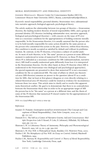 11. Мерцалов А. В. Преимущества психологической теории тождества личности в вопросе о моральной ответственности // Философский журнал. 2023. Т. 16. № 1. С. 177-192. EDN: FYOTRW