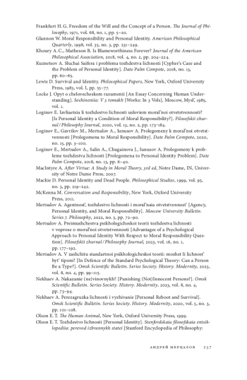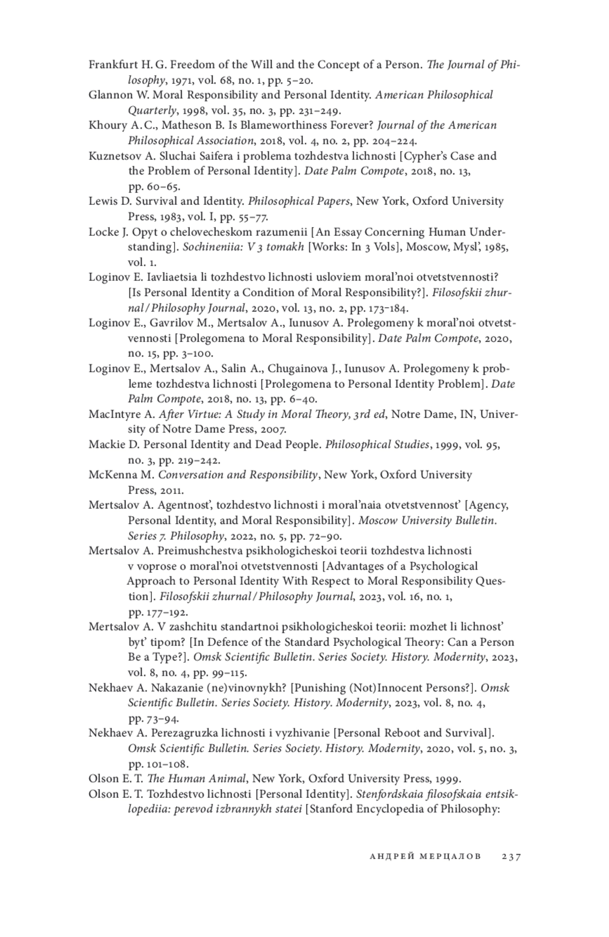 9. Мерцалов А. В. Агентность, тождество личности и моральная ответственность // Вестник Московского университета. Серия 7. Философия. 2022. № 5. С. 72-90.
