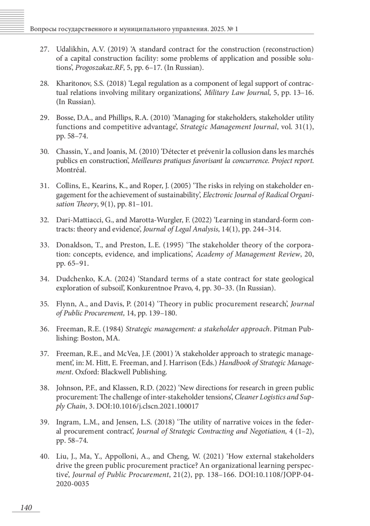 40. Liu J., Ma Y., Appolloni A., Cheng W. How external stakeholders drive the green public procurement practice? An organizational learning perspective // Journal of Public Procurement. 2021. Vol. 21, no. 2. P. 138-166. EDN: SLIUTO