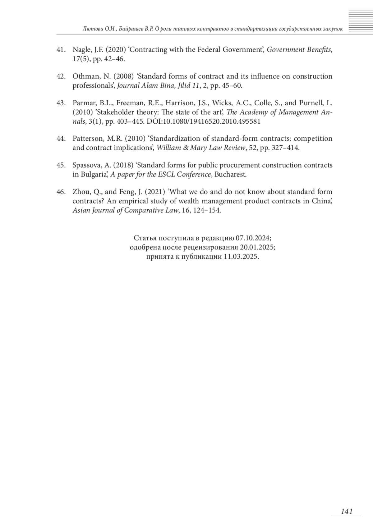 42. Othman N. Standard forms of contract and its influence on construction professionals // Jurnal Alam Bina, Jilid 11. 2008. No. 2. Р. 45-60.