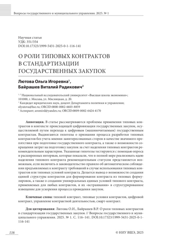 В статье рассматриваются проблемы применения типовых контрактов в контексте происходящей цифровизации государственных закупок, осуществляемой путем перехода к цифровым (машиночитаемым) государственным контрактам. Выдвигаются гипотезы о признании процесса разработки типовых контрактов без учета мнения заинтересованных сторон в качестве значимого препятствия при подготовке государственного контракта, а также о возможности сокращения затрат на подготовку закупок за счет наделения типовых контрактов рекомендательным характером. Указанные гипотезы тестируются с помощью опроса и расширенных интервью, которые показали, что в полной мере реализовать идею наделения типового контракта рекомендательным статусом представляется возможным, если включить в законодательство правило об автоматическом соблюдении предъявляемых к контракту требований в случае использования типовых контрактов или типовых условий контракта. Делается вывод о возможности создания единой структуры контрактов для формирования контракта из типовых формулировок, а также о создании универсальных единых условий типового контракта, применяемых для любых контрактов, и их «встраивании» в структурированное извещение для ускорения процесса проведения закупок