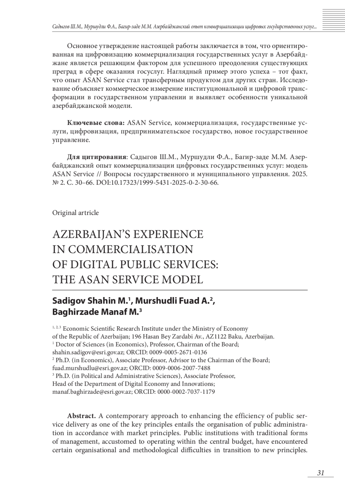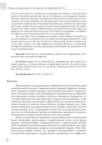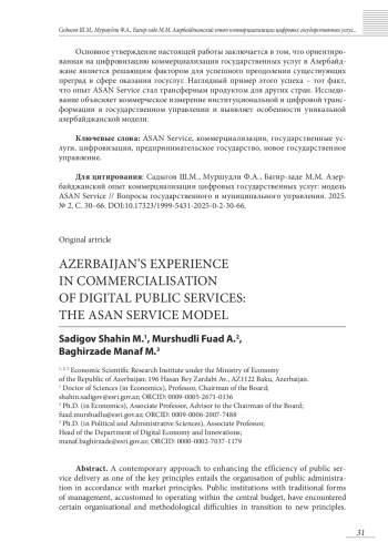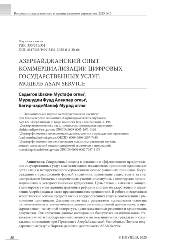 Современный подход к повышению эффективности предоставления государственных услуг в качестве одного из ключевых принципов предполагает организацию государственного управления на основе рыночных принципов. Госучреждения с традиционной формой управления, привыкшие существовать за счет центрального бюджета, в современных реалиях столкнулись с некоторыми организационными и методологическими трудностями. Цель статьи – выявить и концептуализировать опыт административных реформ в системе государственного управления Азербайджана в части преодоления этих препятствий. В работе определяются теоретические основы предоставления государственных услуг в соответствии с рыночными принципами. Дескриптивная часть результатов исследования основана на количественных статистических данных организационной деятельности, а прескриптивная – на научной литературе, правительственных решениях и юридических документах. Эмпирические данные исследования базируются на официальной статистике и отчетах Государственного агентства по оказанию услуг гражданам и социальным инновациям при Президенте Азербайджанской Республики, Портала государственных услуг и Портала данных о деятельности ASAN Service. Основное утверждение настоящей работы заключается в том, что ориентированная на цифровизацию коммерциализация государственных услуг в Азербайджане является решающим фактором для успешного преодоления существующих преград в сфере оказания госуслуг. Наглядный пример этого успеха – тот факт, что опыт ASAN Service стал трансферным продуктом для других стран. Исследование объясняет коммерческое измерение институциональной и цифровой трансформации в государственном управлении и выявляет особенности уникальной азербайджанской модели