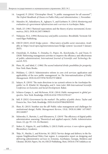 15. Muradov M., Safaraliyeva R., Aghayev Y., Gurbatov N. Monitoring and evaluation of e-government infrastructure and e-services in Azerbaijan. Baku. 2014.