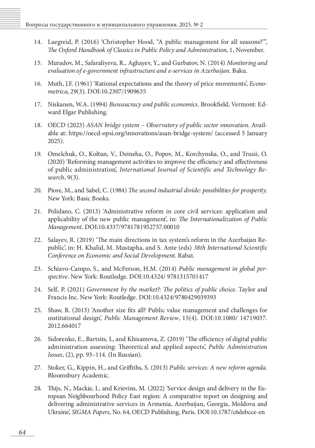 28. Thijs N., Mackie I., Krievins M. Service design and delivery in the European Neighbourhood Policy East region: A comparative report on designing and delivering administrative services in Armenia, Azerbaijan, Georgia, Moldova and Ukraine // SIGMA Papers. 2022. No. 64. OECD Publishing, Paris. DOI: 10.1787/c6debcce-en