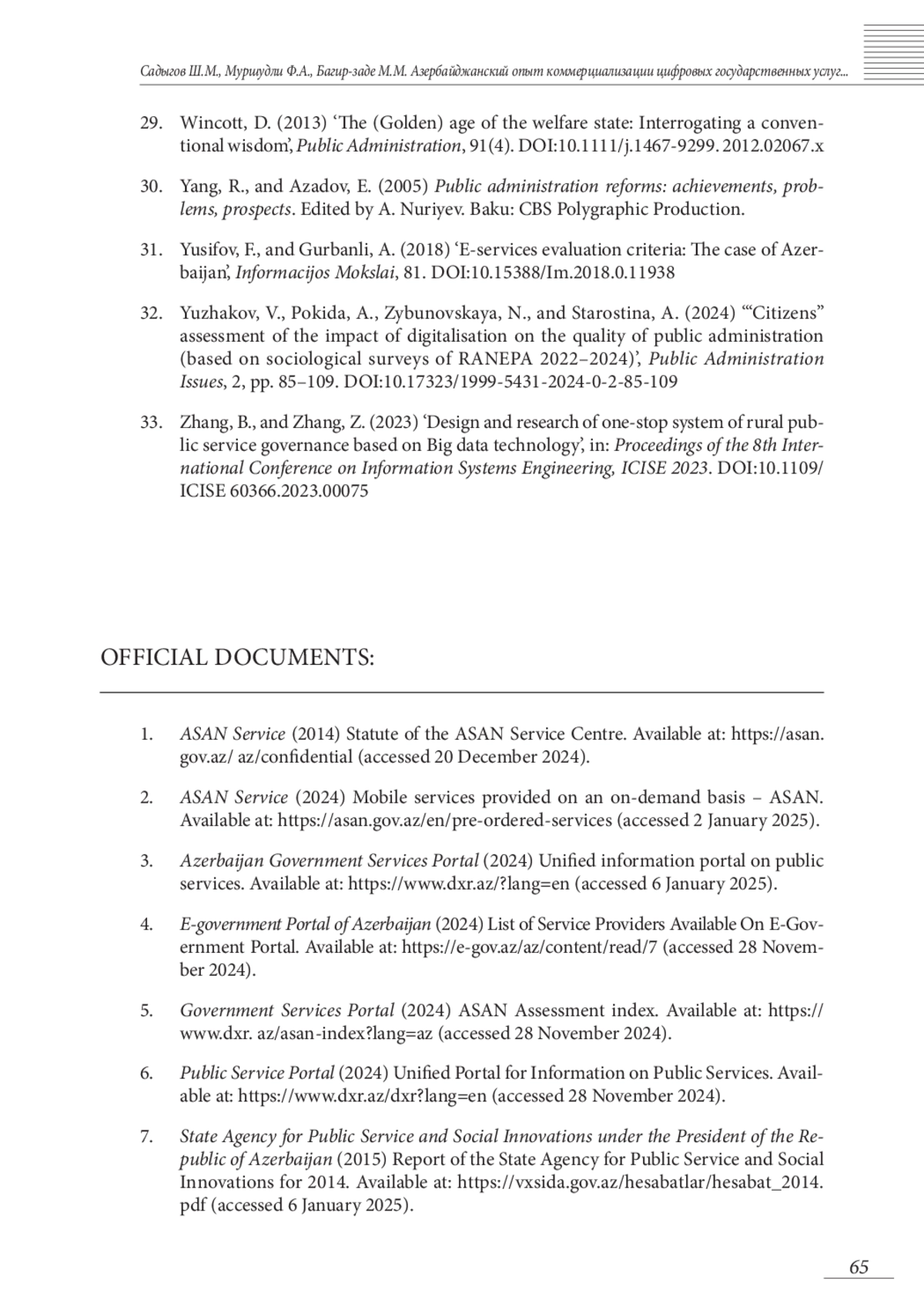 31. Yusifov F., Gurbanli A. E-services evaluation criteria: The case of Azerbaijan // Informacijos Mokslai. 2018. Vol. 81. DOI: 10.15388/Im.2018.0.11938 EDN: FGYFOL