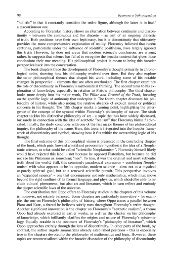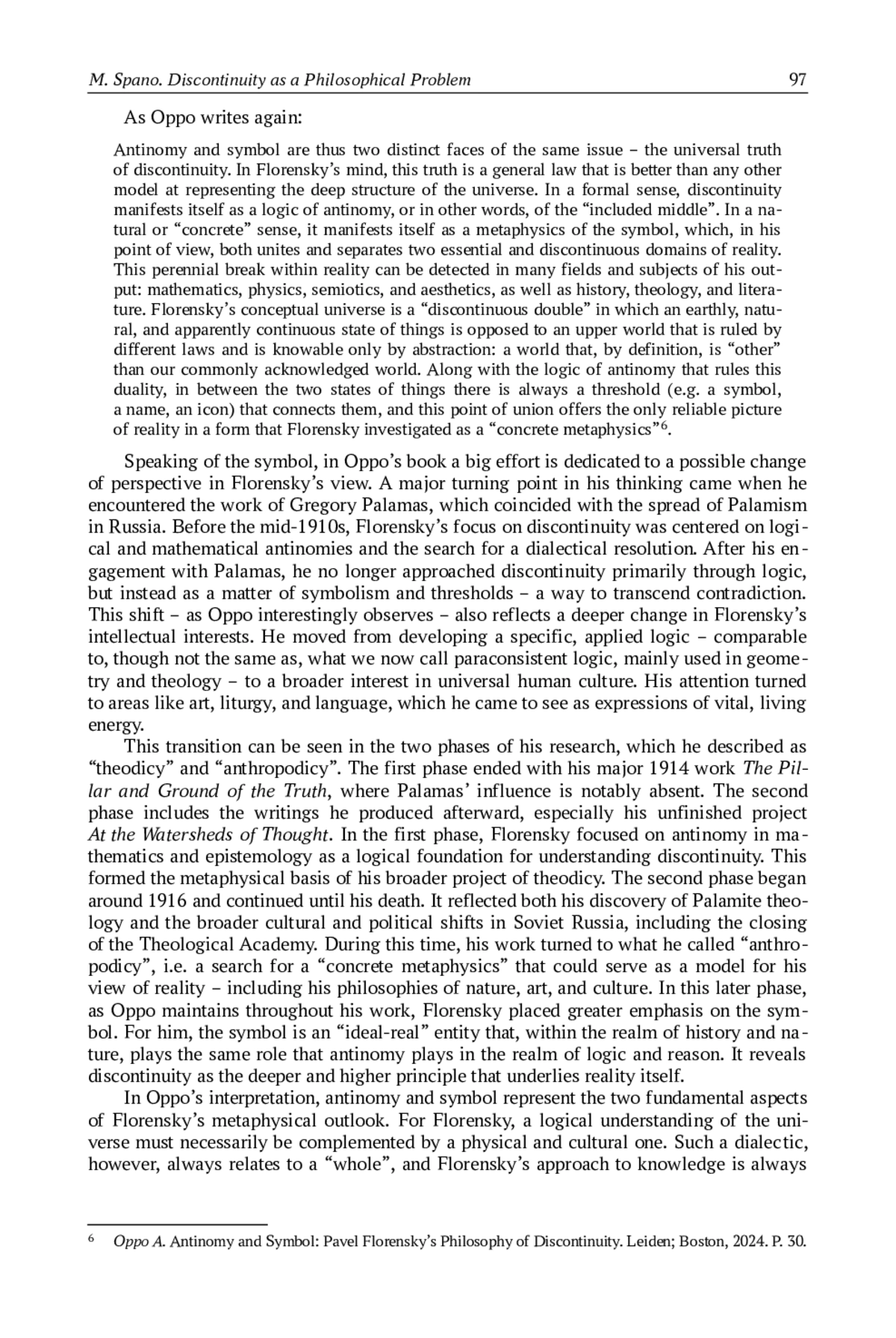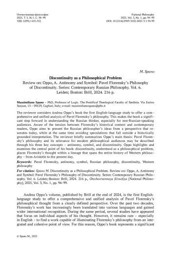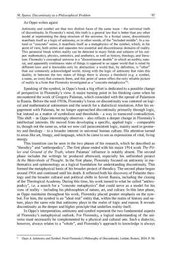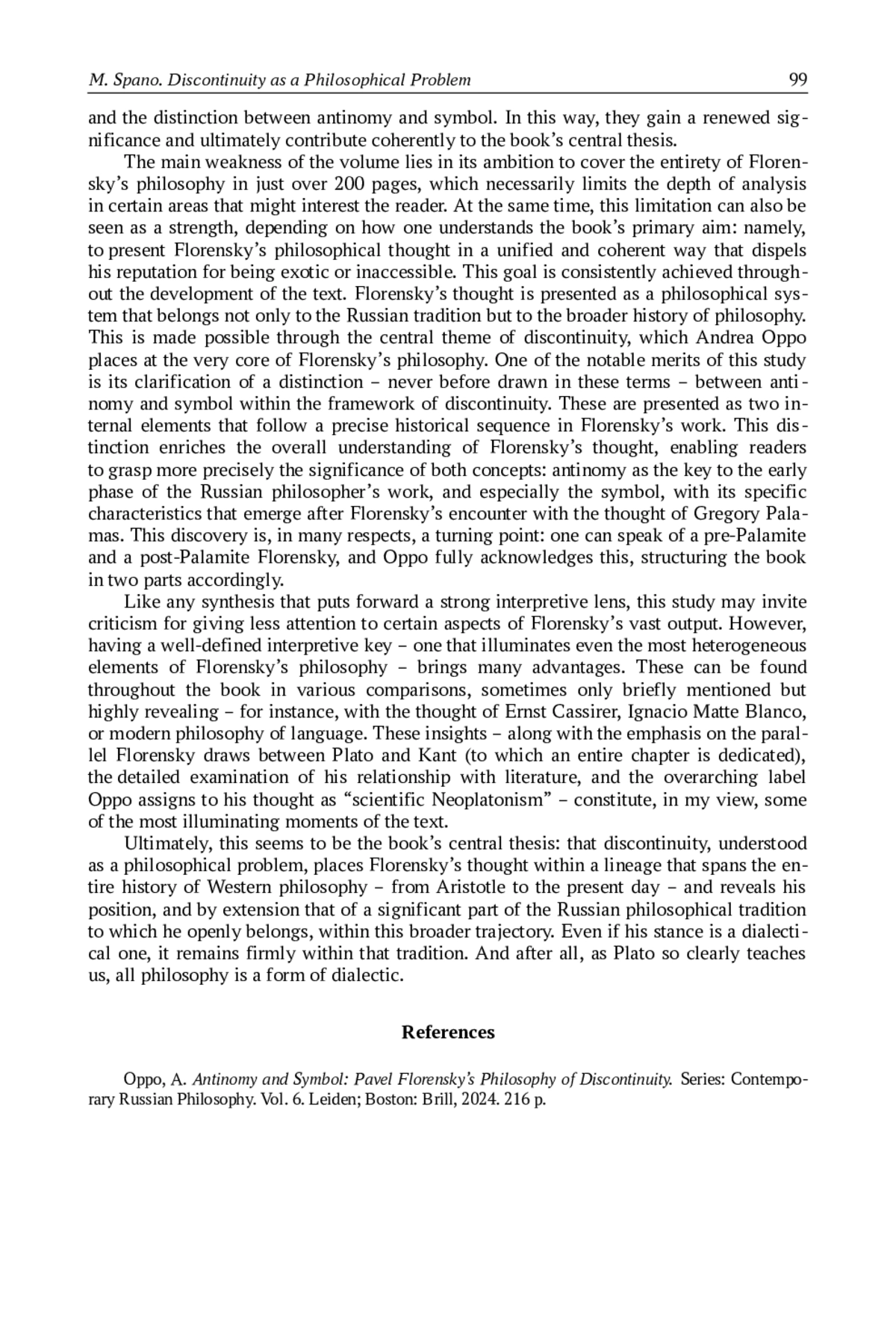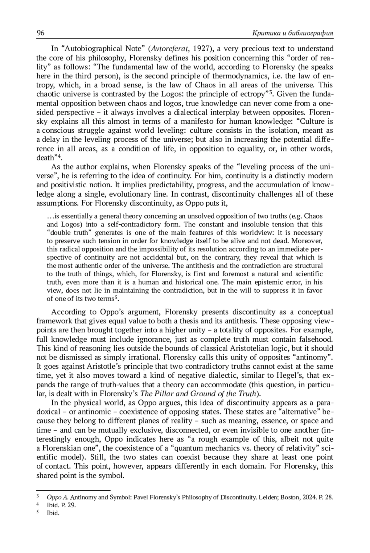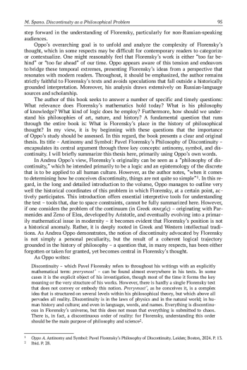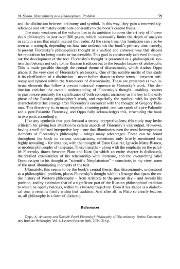 Рецензент считает книгу Андреа Оппо первым англоязычным исследованием, в котором представлен всесторонний и целостный анализ философии Павла Флоренского. Это делает книгу важным шагом на пути к пониманию русского мыслителя, особенно для читателей, не владеющих русским языком. Осознавая противоречие между историческим контекстом, в котором творил Флоренский, и современными читателями, Оппо стремится представить идеи русского философа в свете, актуальном для сегодняшнего дня, и в то же время избежать спекуляций, выходящих за рамки исторически обоснованной интерпретации. Рецензент кратко излагает основной тезис Оппо: философию Павла Флоренского и ее актуальность для современной философской мысли можно описать с помощью трех ключевых понятий — антиномии, символа и прерывности. Оппо выделяет и анализирует главную тему своей книги: разрыв, понимаемый как философская проблема, вписывает идеи Флоренского в контекст всей истории западной философии — от Аристотеля до наших дней.