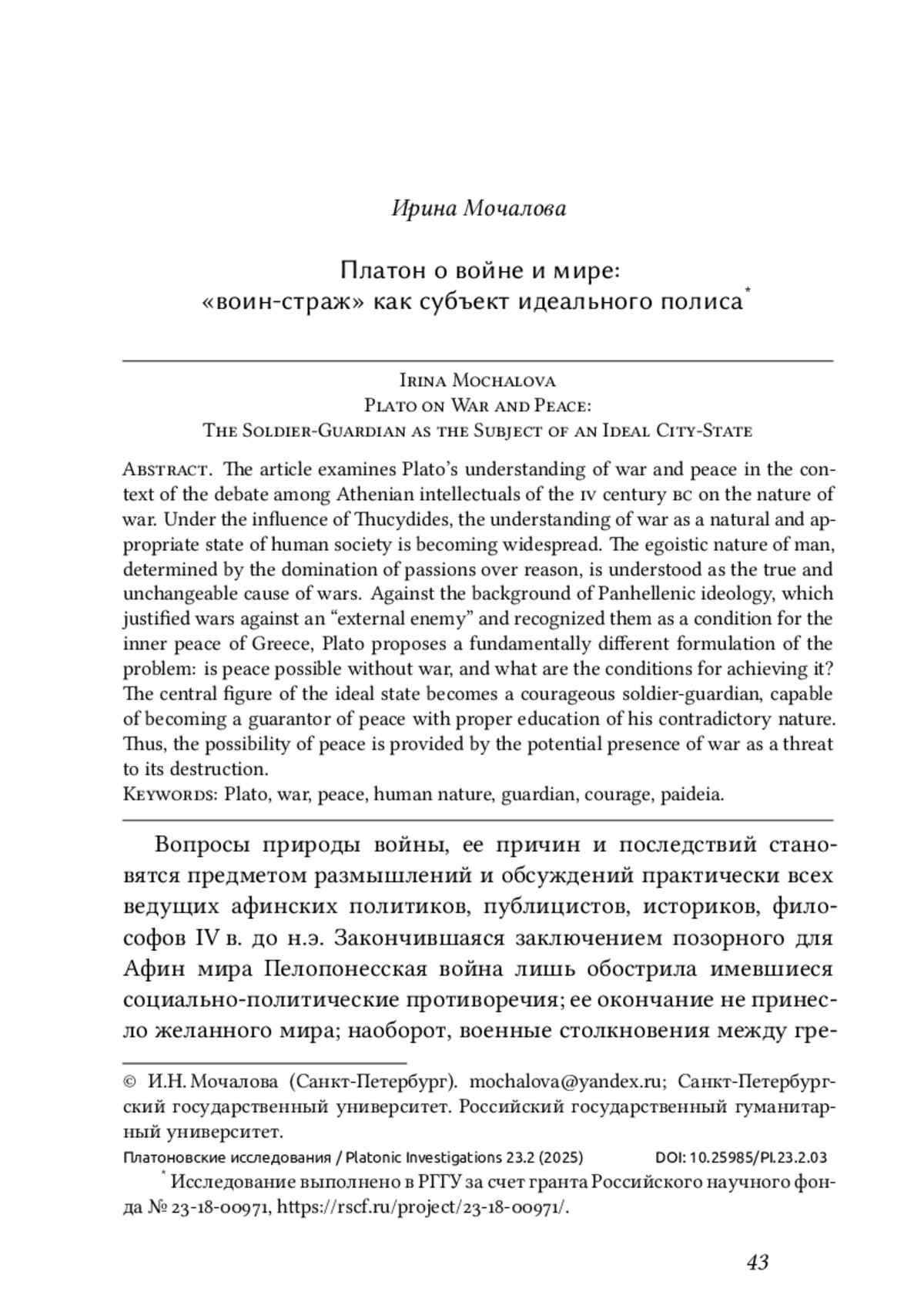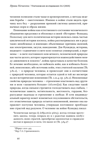 В статье исследуется платоновское понимание войны и мира в контексте дискуссии афинских интеллектуалов IV в. до н. э. о природе войны. Под влиянием Фукидида наибольшее распространение получает понимание войны как естественного и закономерного состояния человеческого общежития. Эгоистическая природа человека, определяемая господством страстей над разумом, понимается как подлинная и неизменная причина войн. На фоне панэллинской идеологии, оправдывавшей войны против «внешнего врага» и признававшей их условием внутреннего мира Эллады, Платон предлагает принципиально иную постановку проблемы: возможен ли мир без войны и каковы условия его достижения? Анализ диалогов «Государство», «Законы», «Тимей» и «Критий» позволяет показать, что, по Платону, человек лишен природной агрессивности, и, следовательно, война не может быть оправдана. Платон переносит вопрос оценки войны в этико-антропологическую плоскость, связывая его с проблемой воспитания и правильного устройства души. Центральной фигурой идеального государства становится мужественный воин-страж, способный при правильном воспитании его противоречивой природы стать гарантом мира. Таким образом, возможность мира обеспечивается потенциальным присутствием войны как угрозы его разрушения.
