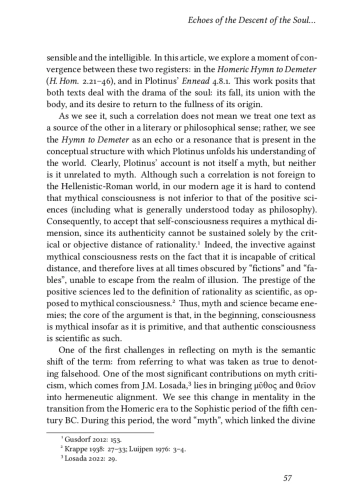 Ancient thought expresses the great questions of existence through both mythical and philosophical language. Although these discourses may seem divergent in their formal structure and immediate aims, they share the same fundamental aspiration: to consider human beings in the root tension that comes from inhabiting the frontier between the sensible and the intelligible. In this article, we explore a moment of convergence between these two registers: in the Homeric Hymn to Demeter (H. Hom. 2.21–46), and in Plotinus’ Ennead 4.8.1. 吀栀is work posits that both texts deal with the drama of the soul: its fall, its union with the body, and its desire to return to the fullness of its origin.
